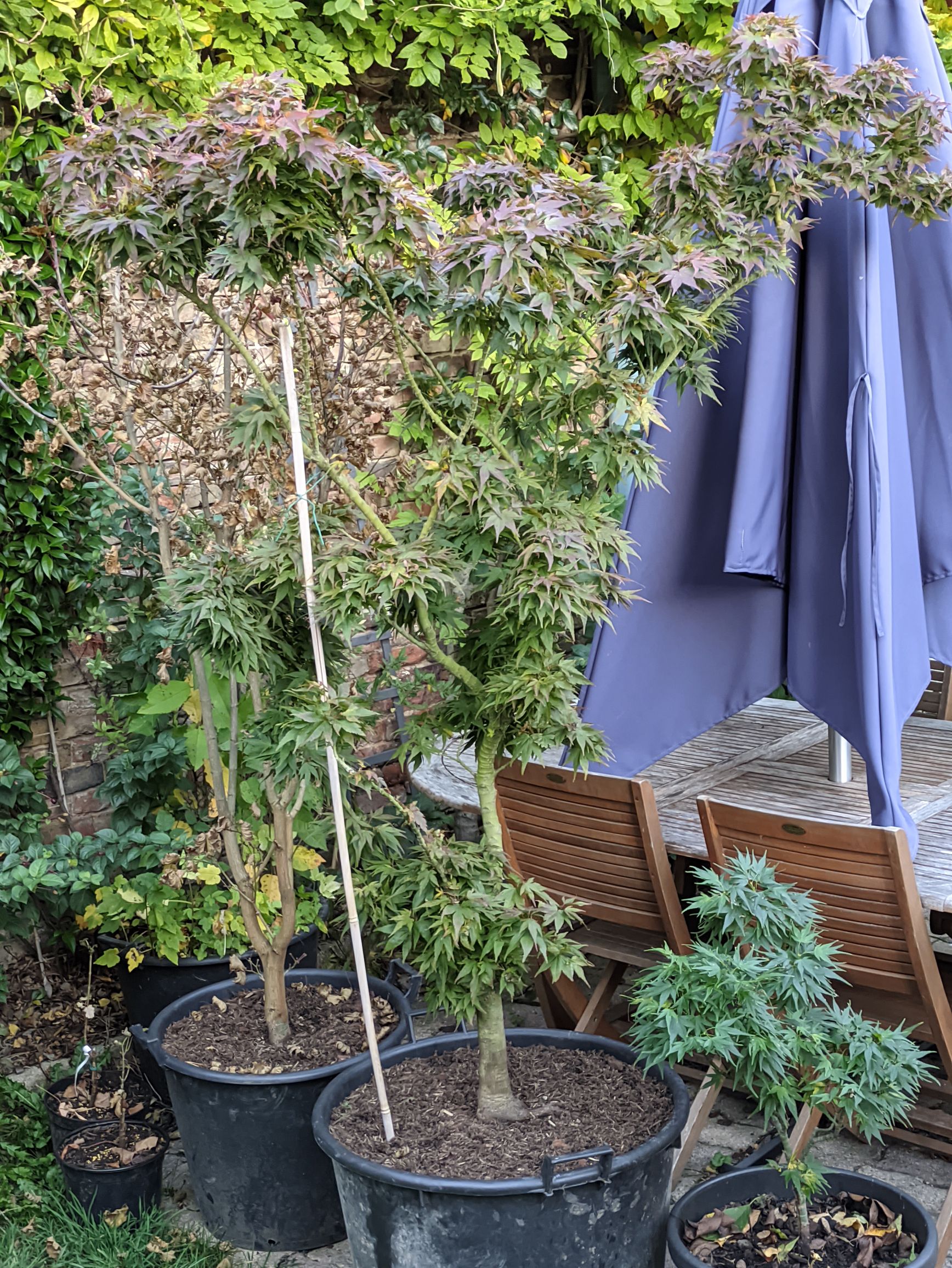 Mikawa Yatsubusa à côté de Skeeter’s Broom (rescapé d'un gel tardif 2 années de suite...) et un bonsaï type :