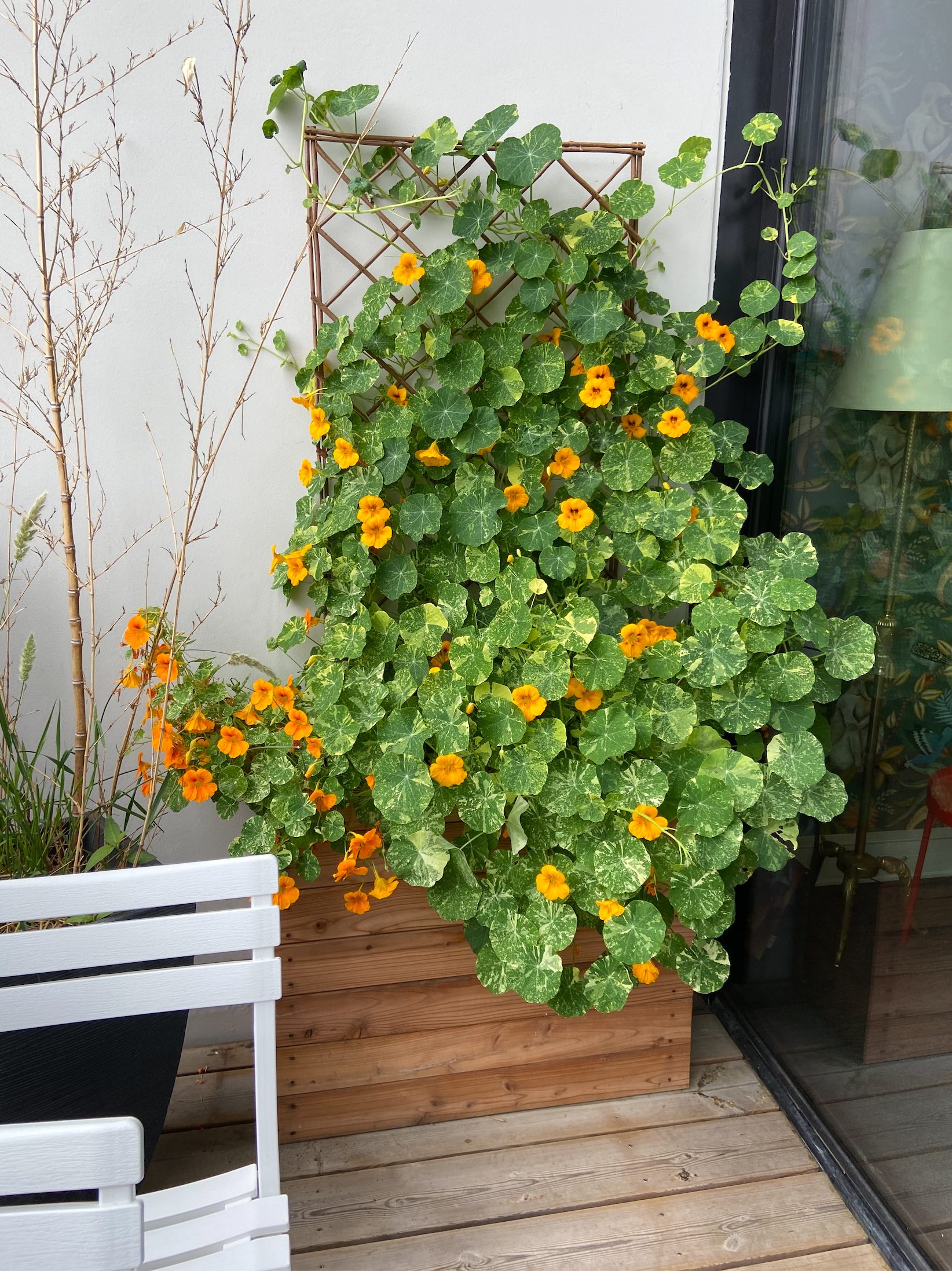 Bonjour Nicole37n, je te conseille de planter des capucines, ça marche à tous les coups et ça se resème d'années en années, au moyen d'une treille ou d'un simple bâton de bambous avec quelques nœuds, la plante va s'agripper et grimper continuellement, cf. ma photo sur un balcon exposé sud également.