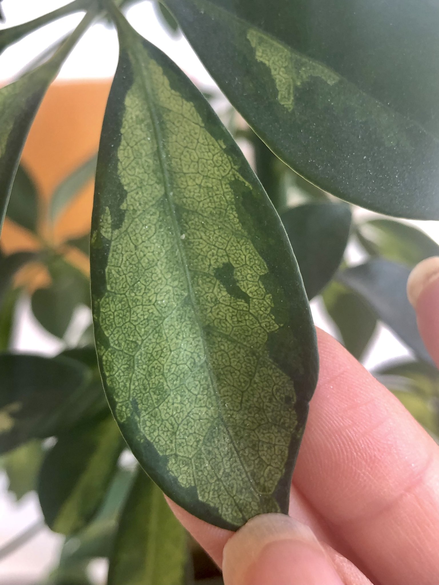 Mon schefflera présente sur certaines feuilles un motifs de mosaïques étrange. Voir photo. Sinon, il n'a pas de signe de faiblesse et ne perd pas ses feuilles. Merci