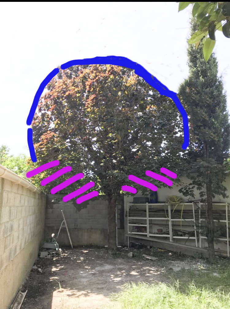 Les hachures roses représentent les branches basses qui encombreraient le passage des engins sous l’arbre, elles pourront être taillées.