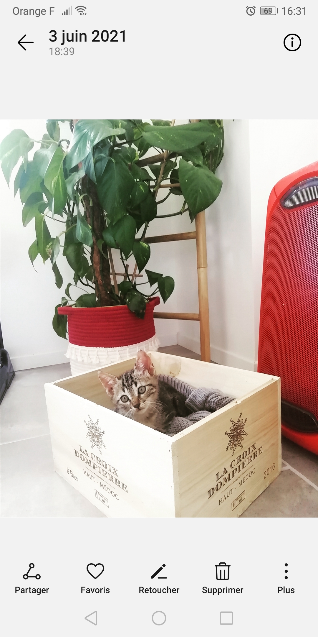Je met une photo le jour de larrive du chat. Ont voit un peu la plante derrière et une à m+1