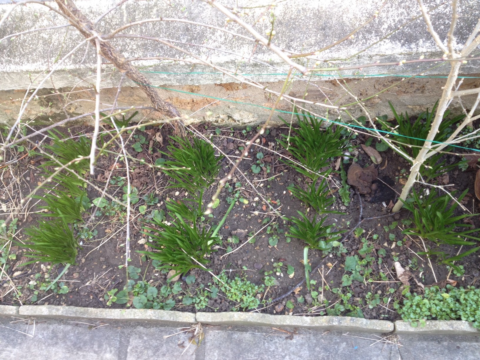 sur une bande de 75 cm x 5 m, le long de ma grille côté rue, le précédent occupant a planté des rangées de jonquilles, narcisses, jacinthes je ne sais précisément, ce sont des rangées bien ordonnées (voir photo) qui me ravissent en janvier ou février, mais le reste du temps, il n'y a rien, à part des rejets d'arbre comme vous voyez, que je vais enlever soit dit en passant, donc ne pas en tenir compte.