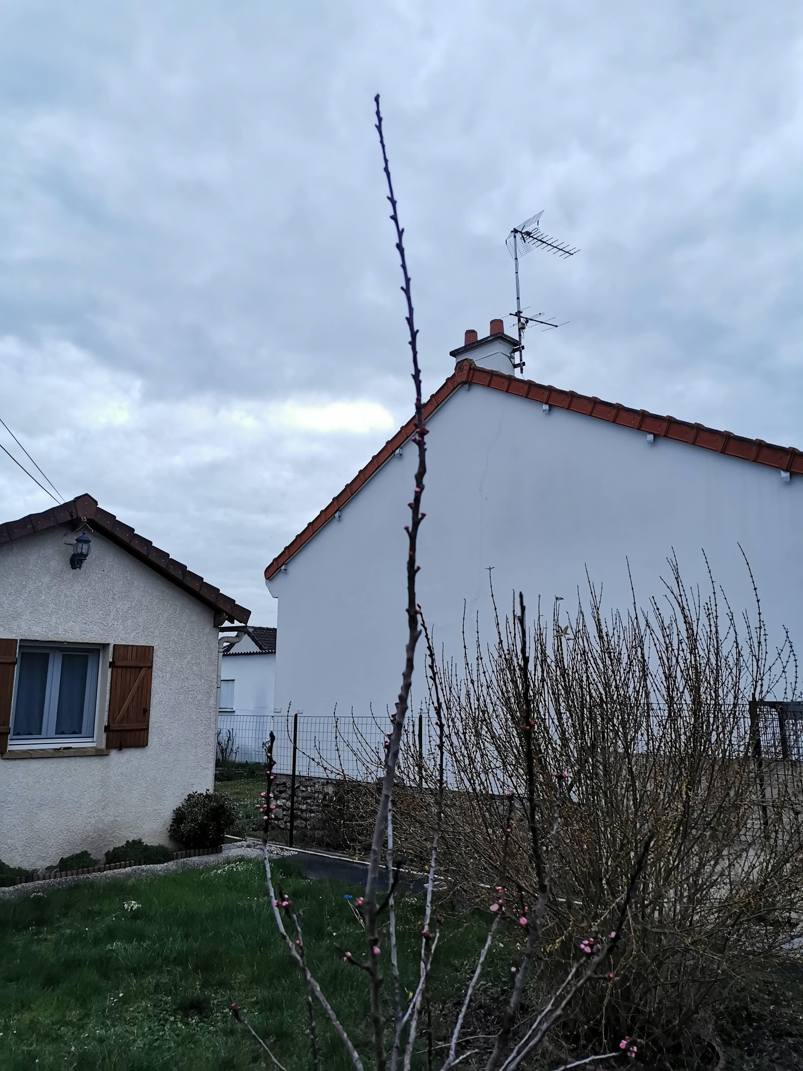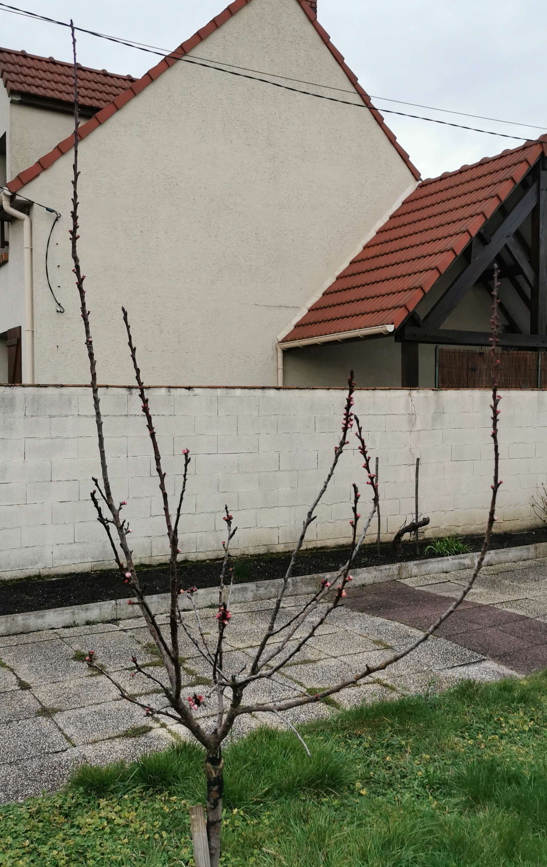 J'aimerais pouvoir essayer de le protéger du gel car il reste certainement un bon nombre de gelées à venir, même dès ce week-end, mais déjà que le voile mis l'an passé fait déjà tomber pas mal de fleurs avec le vent, là il y a surtout une très grande branche poussée à la verticale qui empêche la mise en place.
