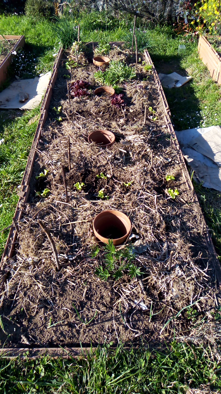 La c'est le futur rectangle tomate qui aura aussi quelques patates, des salades, radis... Un mix. J'ai mis 4 pots enterrés avec l'idée de faire des sortes d'ollas