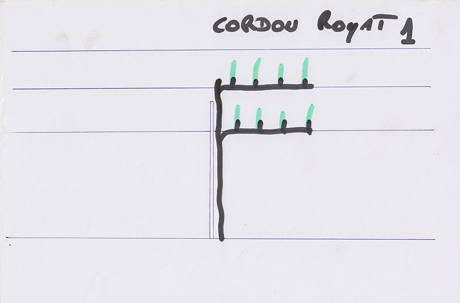 Voilà on y est, j'ai planté l'année passée mon Chenin et mon Muscaris ( 48 pieds), je dois prévoir ma première taille, a la base je voulais partir vers une taille en Guyot simple, mais étant fort habitué à la taille dans ma serre en cordon Royat je me dis que j'aurais plus facile à diriger mes vignes comme cela