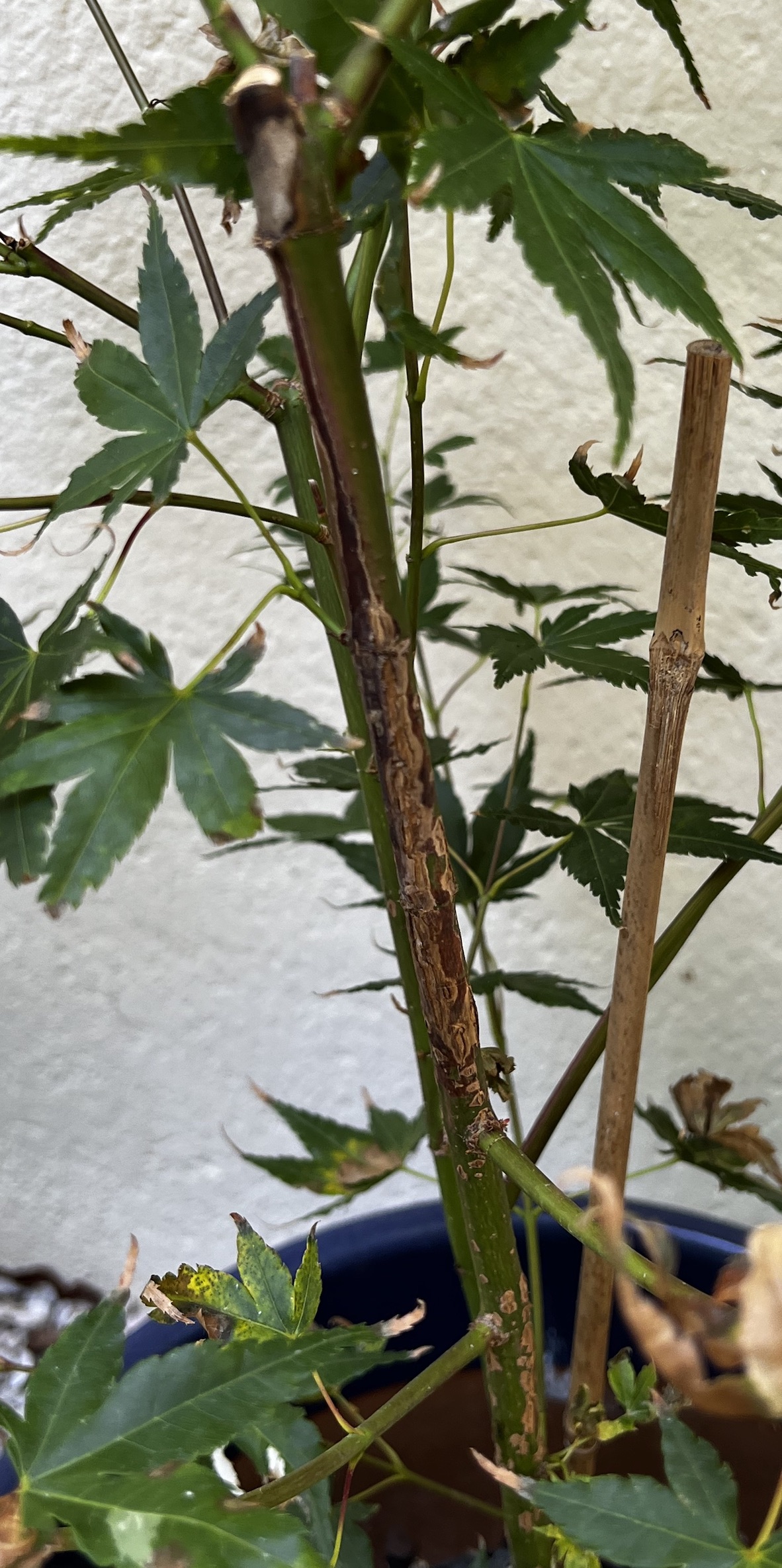 D’abord ces branches n’auraient pas du être coupées, c’est le port vertical typique de sango kaku qui a été massacré; le vendeur manquait t-il de place ?