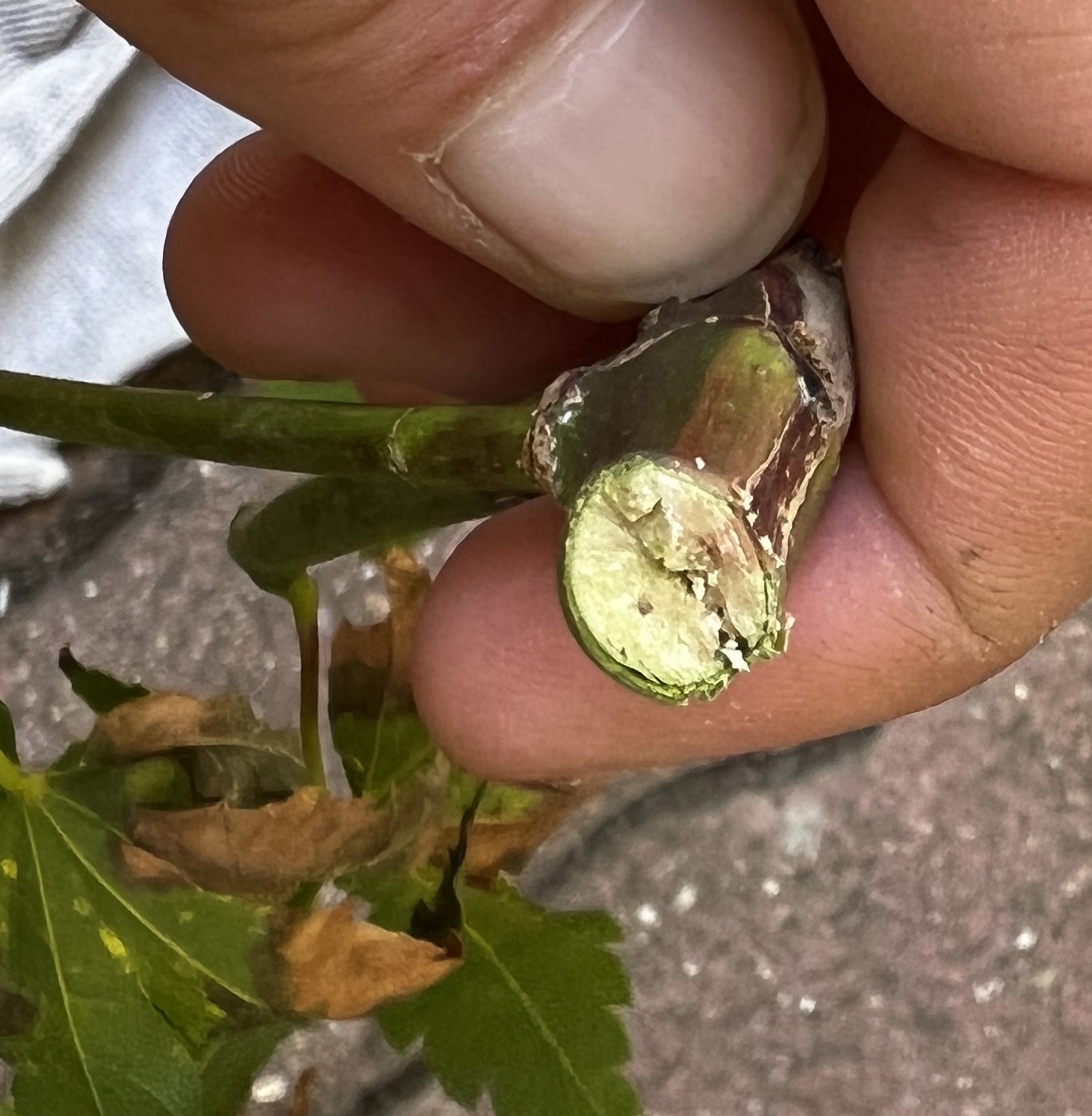 Les tiges de l’année des jeunes érables perdent souvent leurs feuilles en été. Très souvent le bourgeon terminal noircit et ne se développe pas (soit brulure de la tige très fine, soit bactériose apportée par une pluie) mais des bourgeons dessous sont en bon état et ne demandent qu’à pousser; donc on coupe pour supprimer le bourgeon terminal, sans attendre.