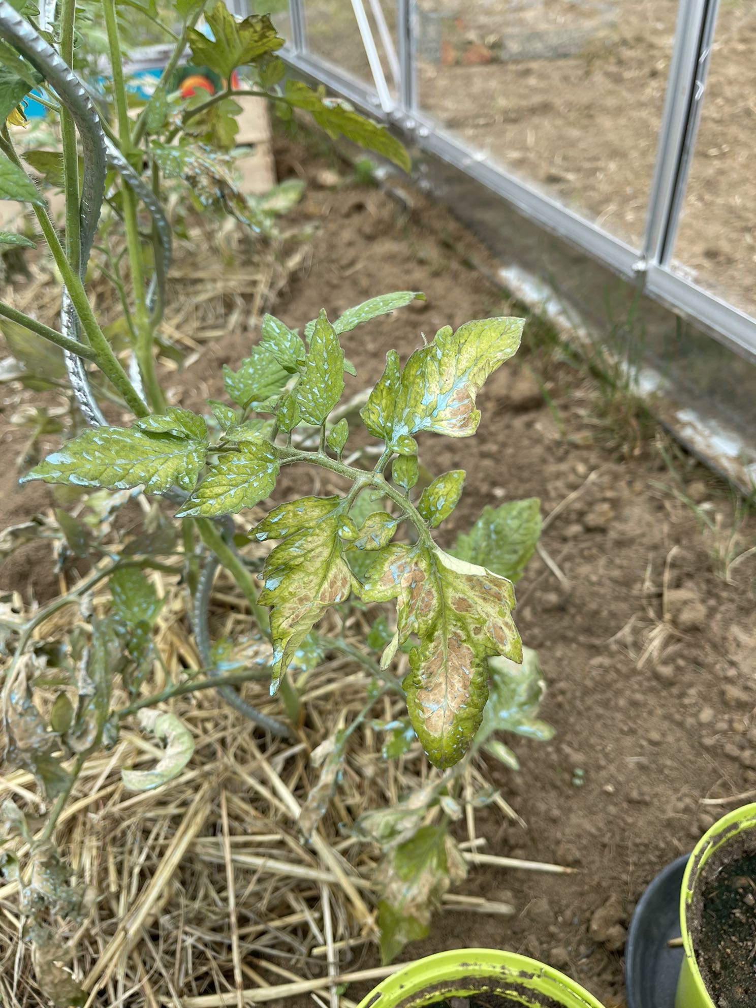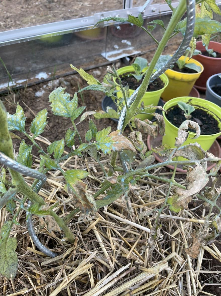 Il y a 15 jours, j’ai mis mes plants de tomates dans ma serre en verre. J’arrose tous les 2/3 jours, mais les feuilles blanchissent par le centre et se dessèchent. Cela a commencé dès la mise en terre. La partie haute continue de pousser et quelques tomates se forment mais j’ai l’impression que les tâches progressent…