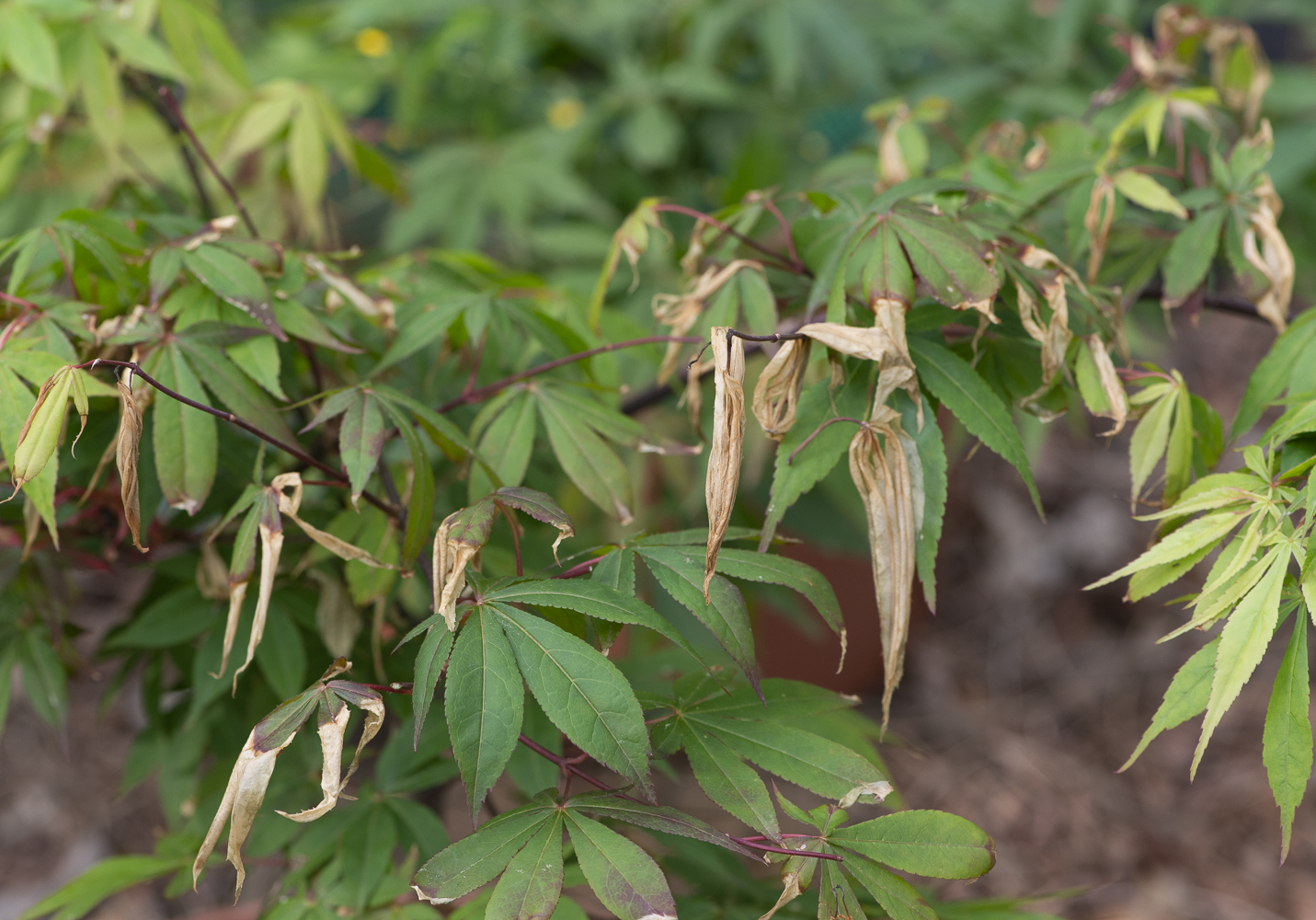 Ca fait penser à un épisode de gel, même léger s'il y a du vent. Les érables du Japon craignent le vent..