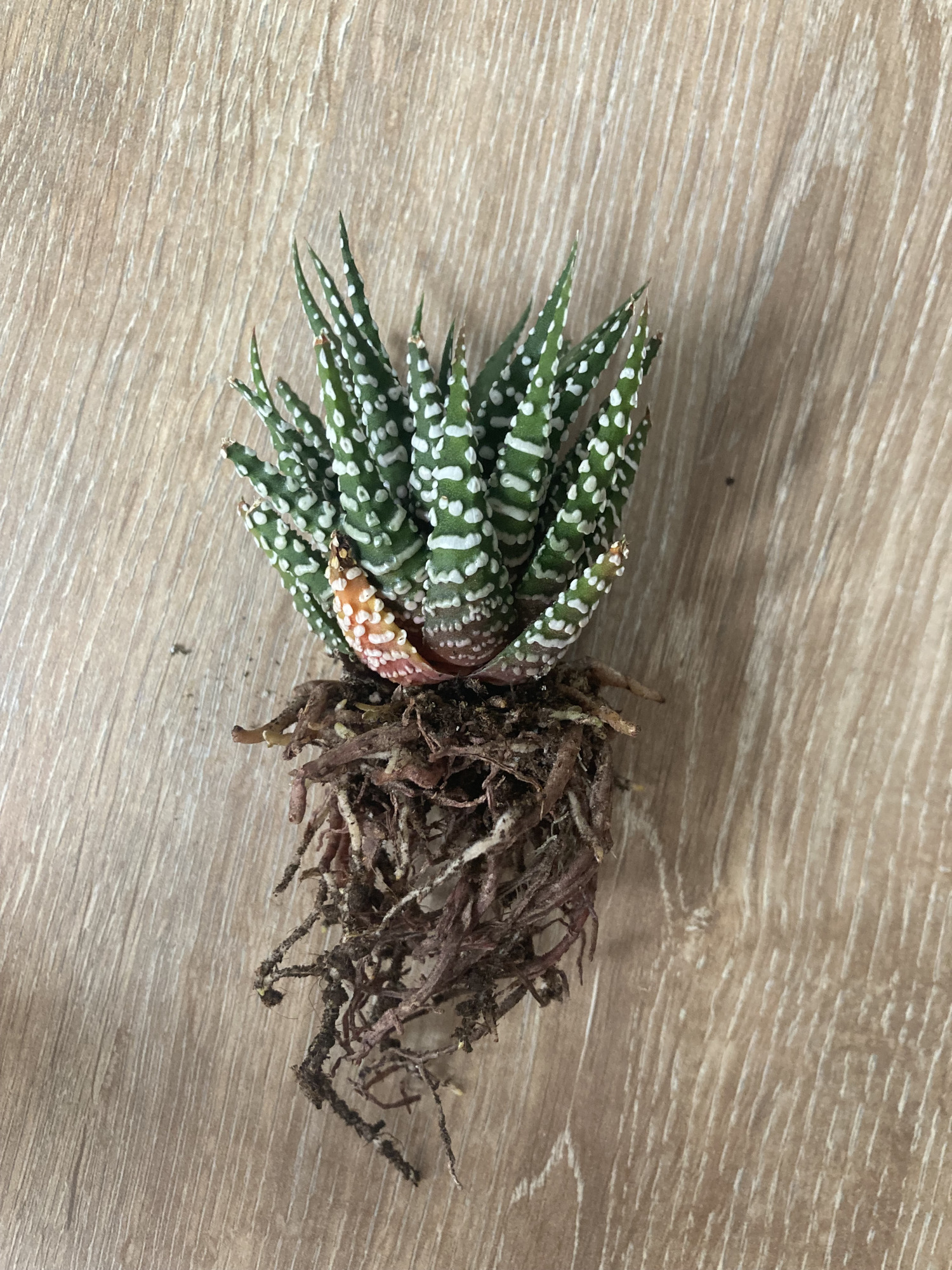 Je viens chercher de l'aide car je suis un débutant et je n'arrive pas a savoir pourquoi mon Haworthie pourri, je l'ai donc retiré de son pot pour le prendre en photo et vous montrez le problème.