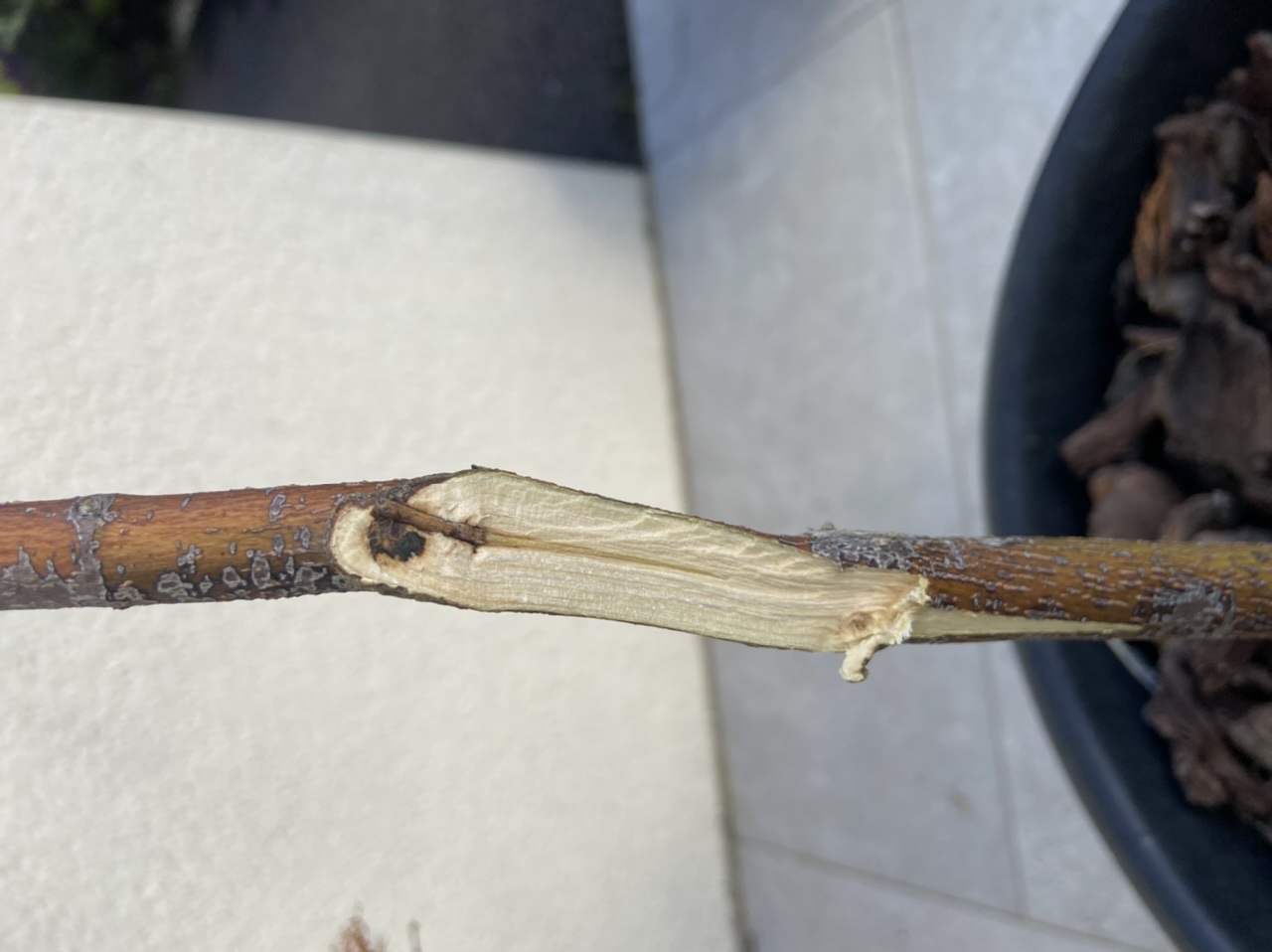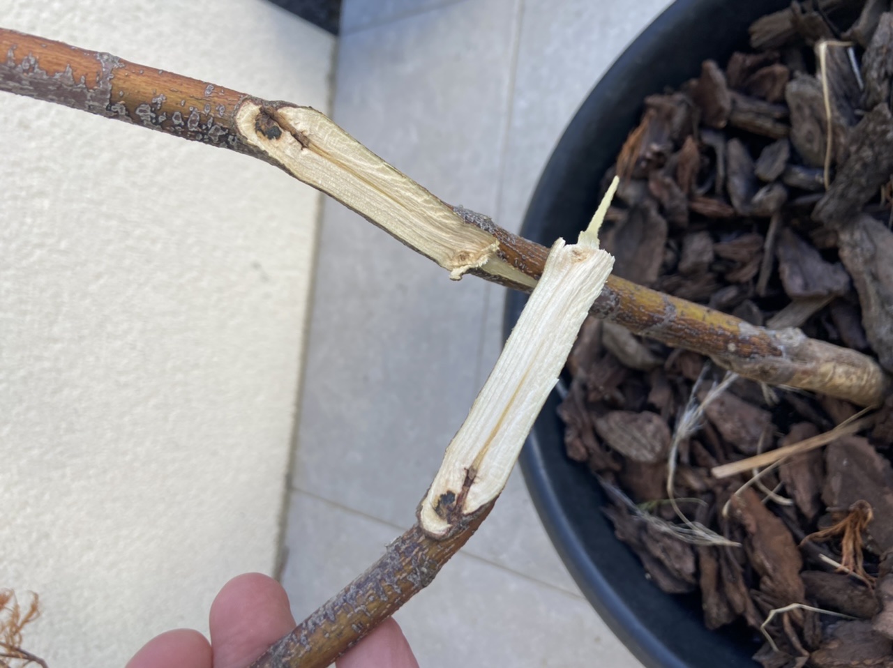 Je suite j’ai cassé quelques branches plus haute, il y a avait, au centre de la branche un tout petit peu de vert.