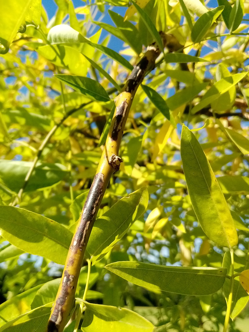 Re: Jeune sophora pleureur: feuille jaune taché et jeune branche tache brune.