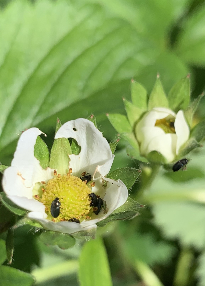 Depuis quelques jours toutes les plantes de ma terrasse (hortensias rosiers fraisiers etc..) sont infectés d’insectes volants qui squattent les pétales et fleurs ! Je n’ai pas réussi à les identifier afin de soigner ou de prévenir. Est ce que c’est des « moucherons »car j’en ai souvent quelques unes dans ma cuisine. Pourriez-vous m’aider s’il vous plaît ?! Les plantes fleurs et fraises sont elles menacées ? J’ai pris quelques photos.