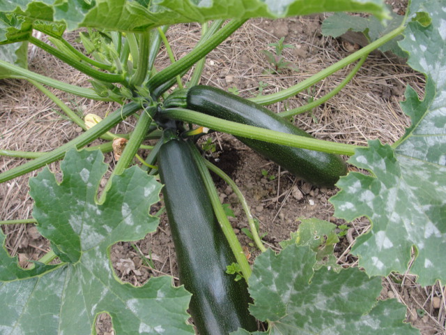 Cette canicule précoce a eu un effet surprenant: les courgettes ont le même avancement en serre et en PT.