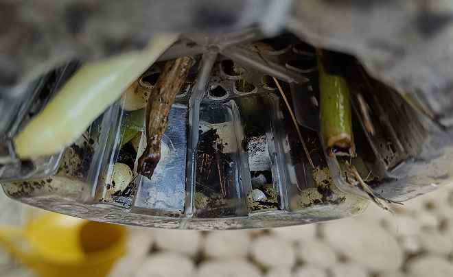 Avant arrosage on voit mieux le côté "poilu" des racines incriminées : Après trempage : Morceau d'écorce tout blanc qui m'inquiète, au fond du pot : Qu'en penses-tu ?