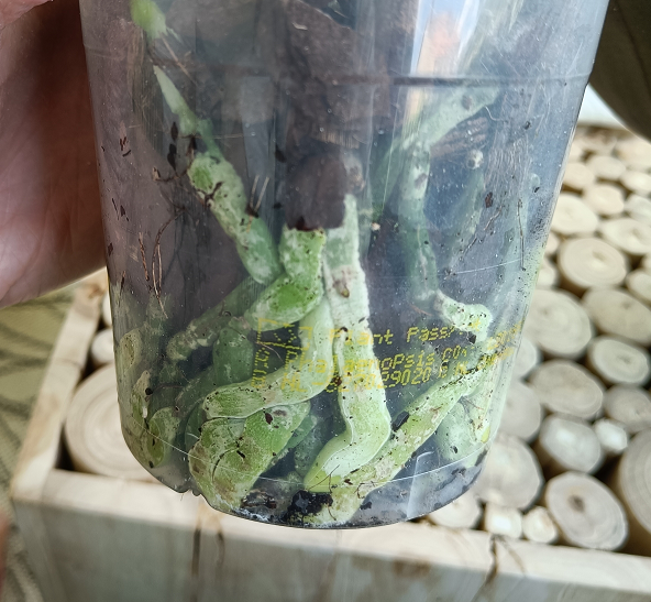 Si tu rempotes choisis un pot à peine plus grand et utilises des écorces de pin, surtout pas du terreau à orchidées qui n’est pas adapté aux épiphytes. Tu peux même réutiliser une partie des écorces et copeaux du pot actuel, à part le petit bout touché de moisissure ils semblent encore sains.