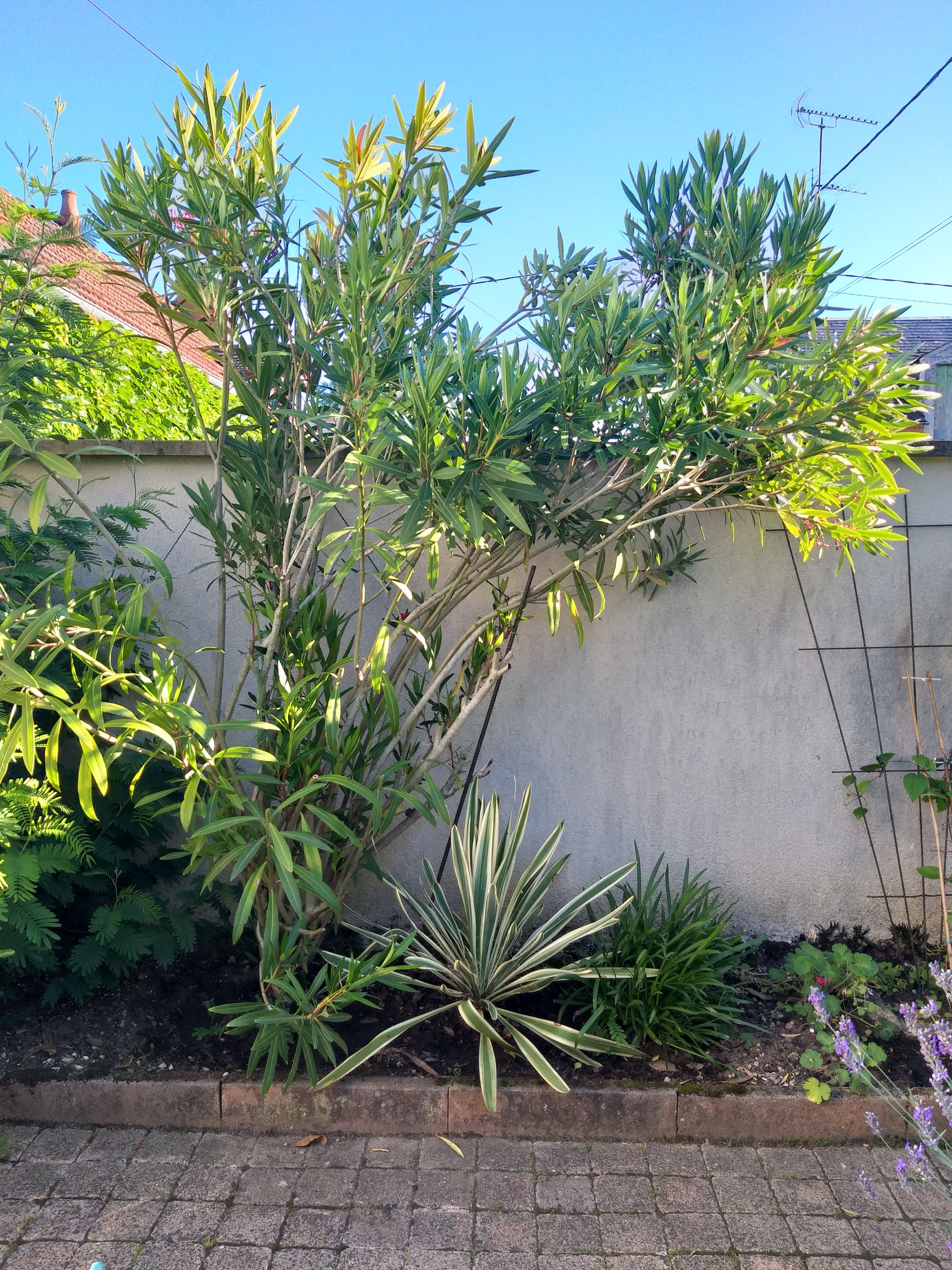 Voilà, oui, je pense couper toutes ces branches qui dépassent le mur. Il y en a plein de petites qui repoussent en bas, j'aurais vraiment dû le faire l'an passé. En plus, le mimosa de gauche me le pousse sans arrêt vers la droite. (lui est rabattu chaque année)