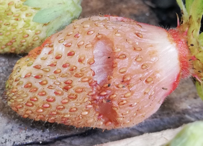 J'ai ouvert la fraise en deux pour voir l'intérieure et j'ai rien trouvé de suspect mis à part une chaire qui a tendance à être transparente...
