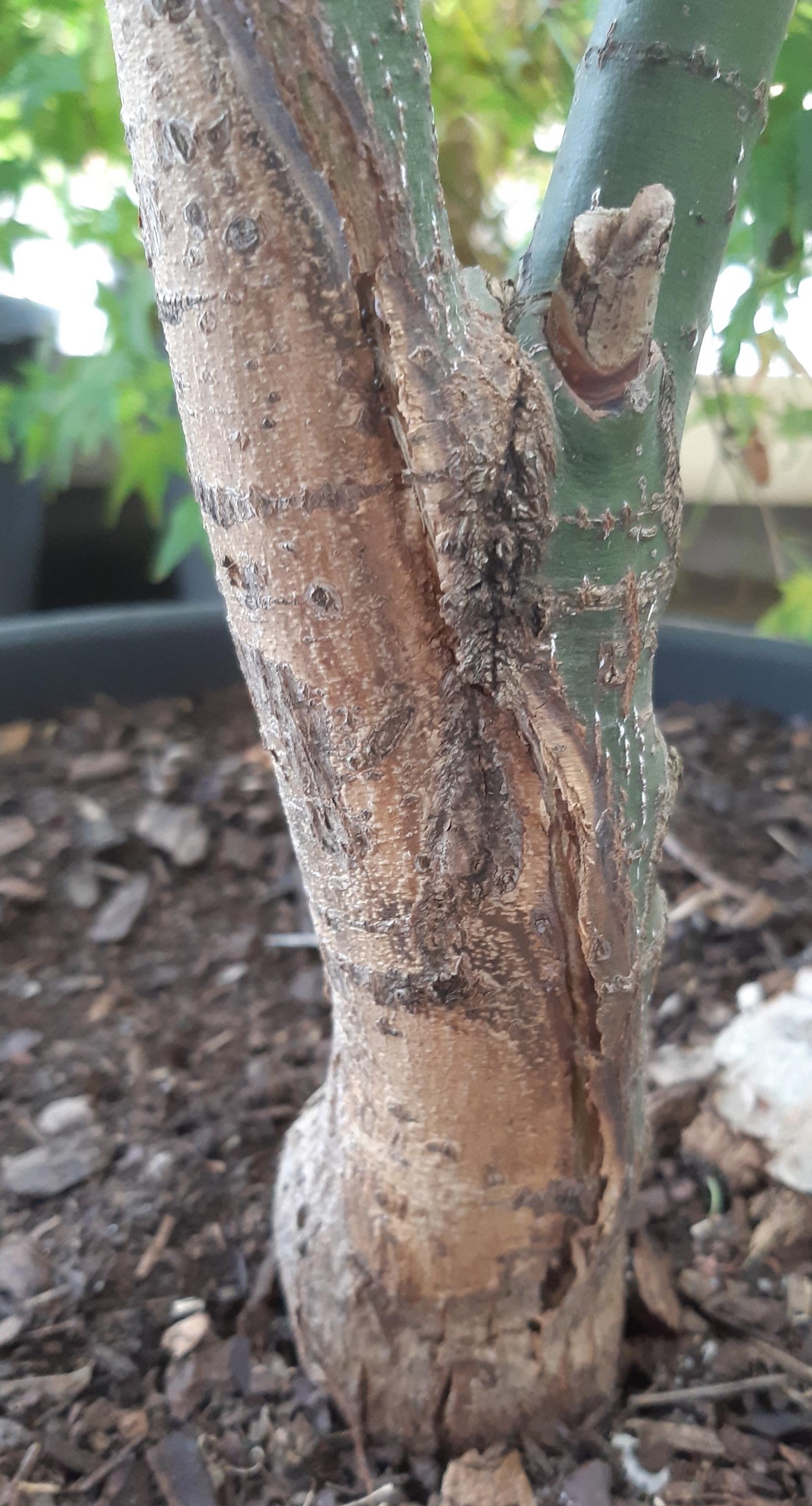 Bonjour. Le tronc de mon érable japonais (planté en pot sur terrasse) a depuis quelques mois un étrange aspect. L'écorce se détache par endroit. Sur différents sites on parle beaucoup de verticilliose mais je n'ai pas l'impression que les symptômes correspondent. Par ailleurs je n'ai pas remarqué d'insectes particuliers. Merci!