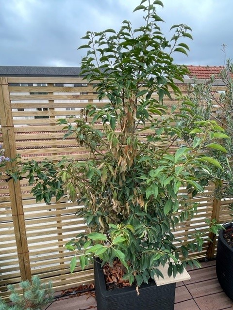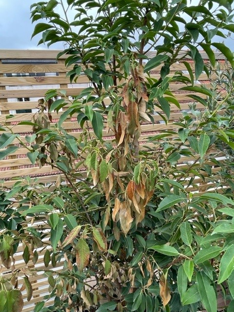 Par contre, l'une des branches de cet arbuste commence à avoir plein de feuilles mortes, ça concerne toute la branche en fait (cf. photo ci-dessous).