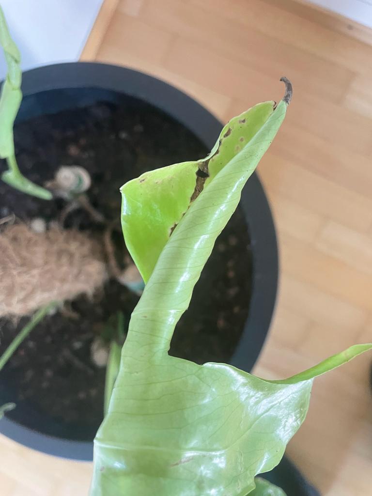 La maladie est apparue après quelques temps sur ma première Monstera. Toutes les feuilles ont commencées a avoir des taches brunâtres et se recroqueviller. Finalement j'ai décidé de toutes les couper, mais les nouvelles pousses reviennent avec le même problème.