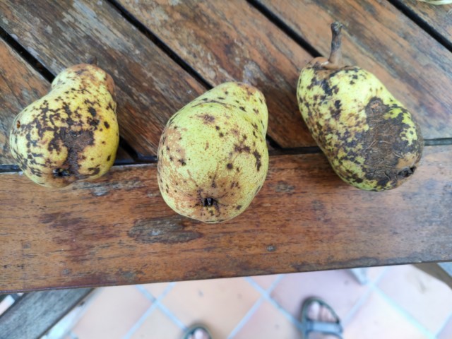 Ça ressemble à une bonne grosse tavelure. Pourtant l'année ne s'y prête pas vraiment, puisque la tavelure sévit d'autant plus que l'année est humide, ce qui n'est pas vraiment le cas cette année...
