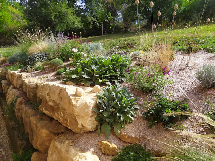 Au soleil, c'est beaucoup plus varié ! Surtout des vivaces de garrigue : thyms (beaucoup car j'adore, persistant, pousse rapide, mellifère, en boule ou en tapis couvre sol, différentes couleurs de feuillages...), santolines, lavandes, sauges, stipa, ballotes, oreilles d'agneaux, géraniums vivaces, gauras, tanacetum densum, hélichrysum, sedum, armoises et pleins d'autres.... Érigerons entre les pierres qui se ressèment +++ et tant mieux !