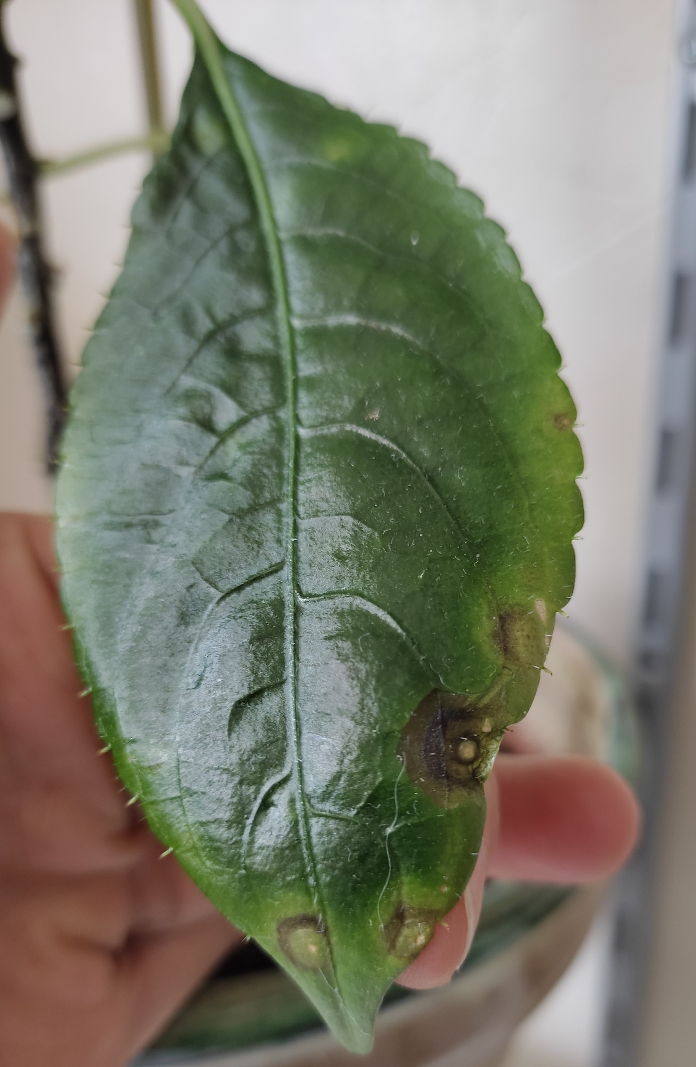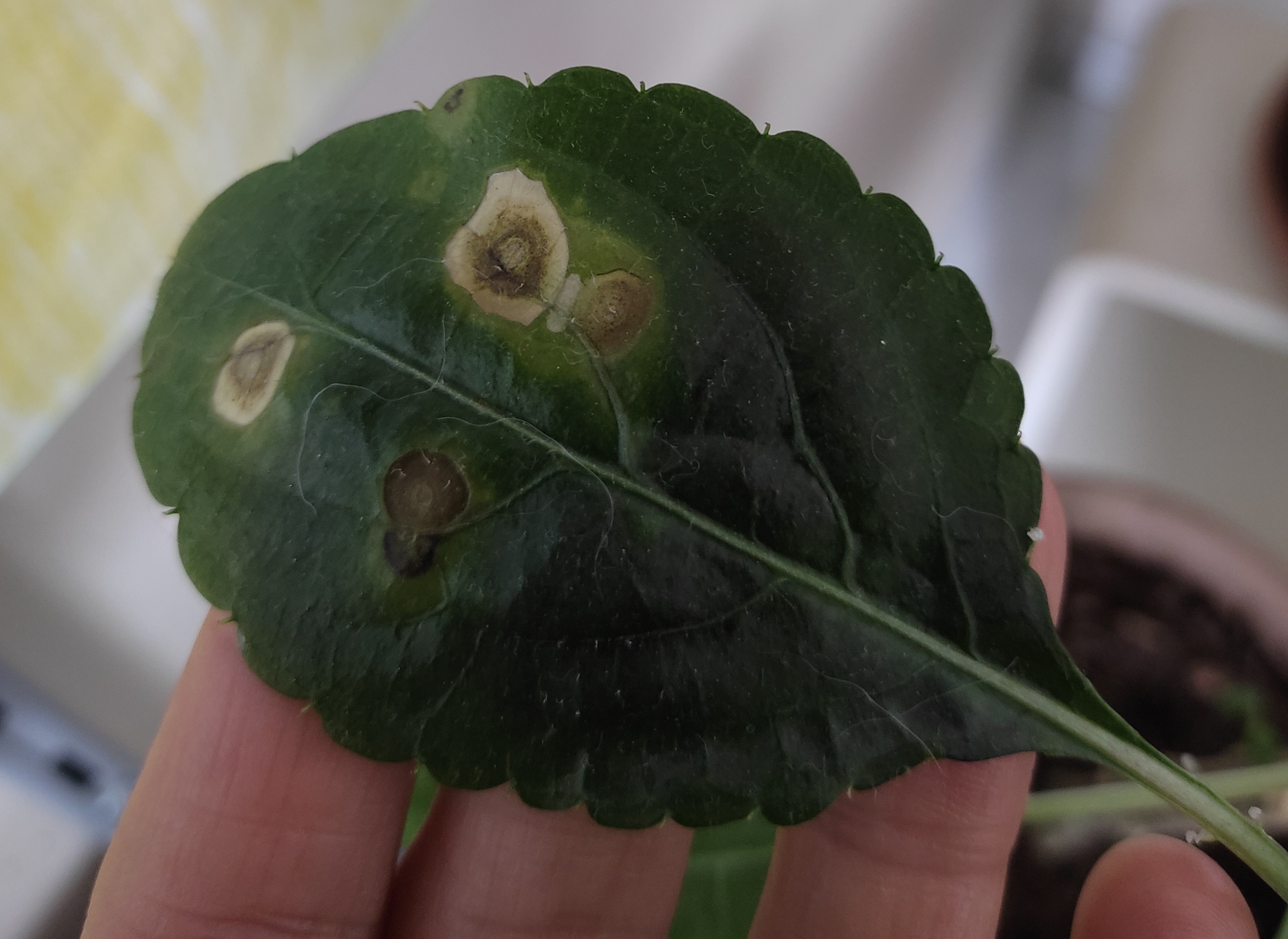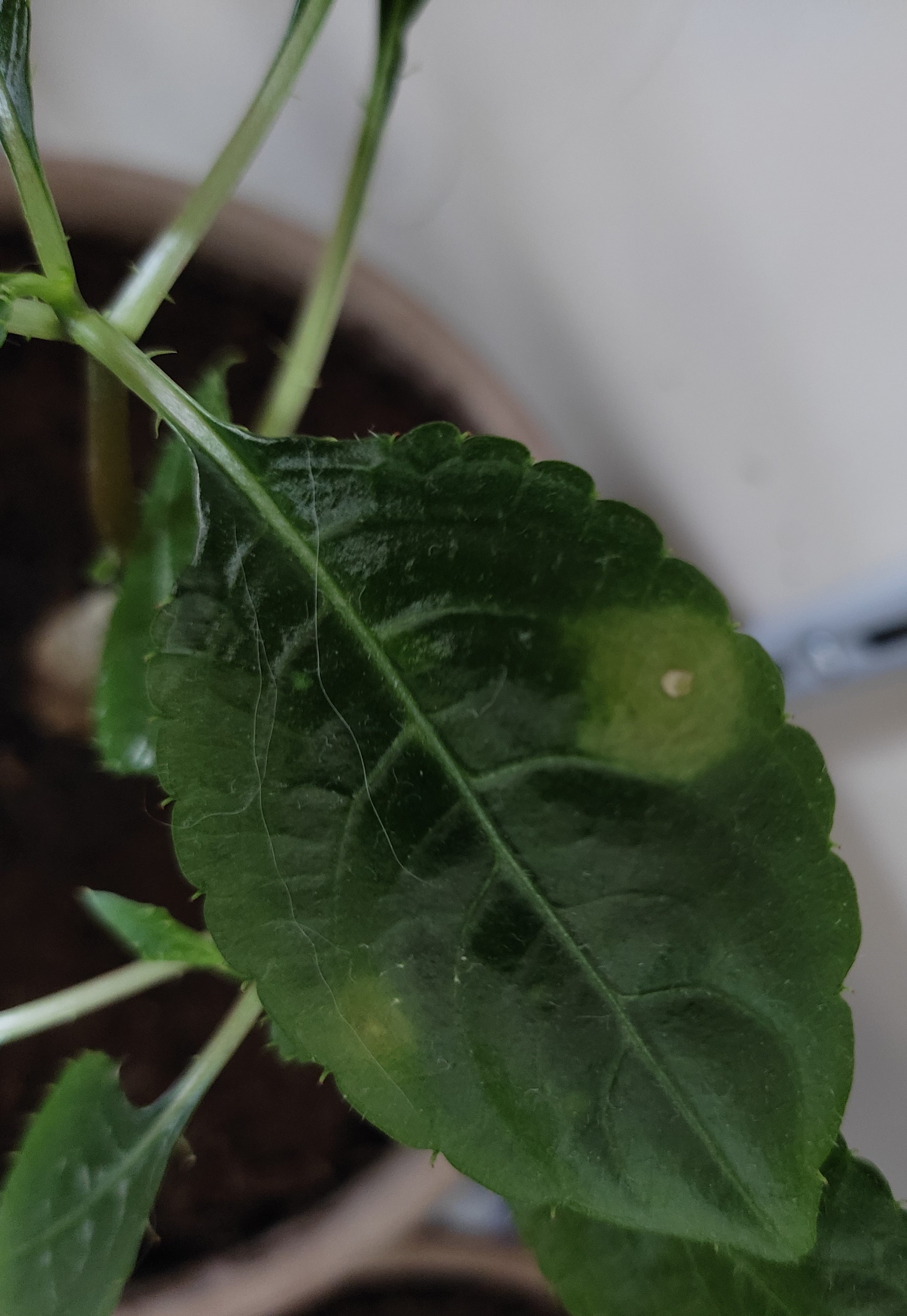 Depuis quelques semaines, des taches brunes cerclées de jaune sont apparues sur certaines feuilles de mes impatiens niamniamensis, provoquant leur jaunissement et leur chute.