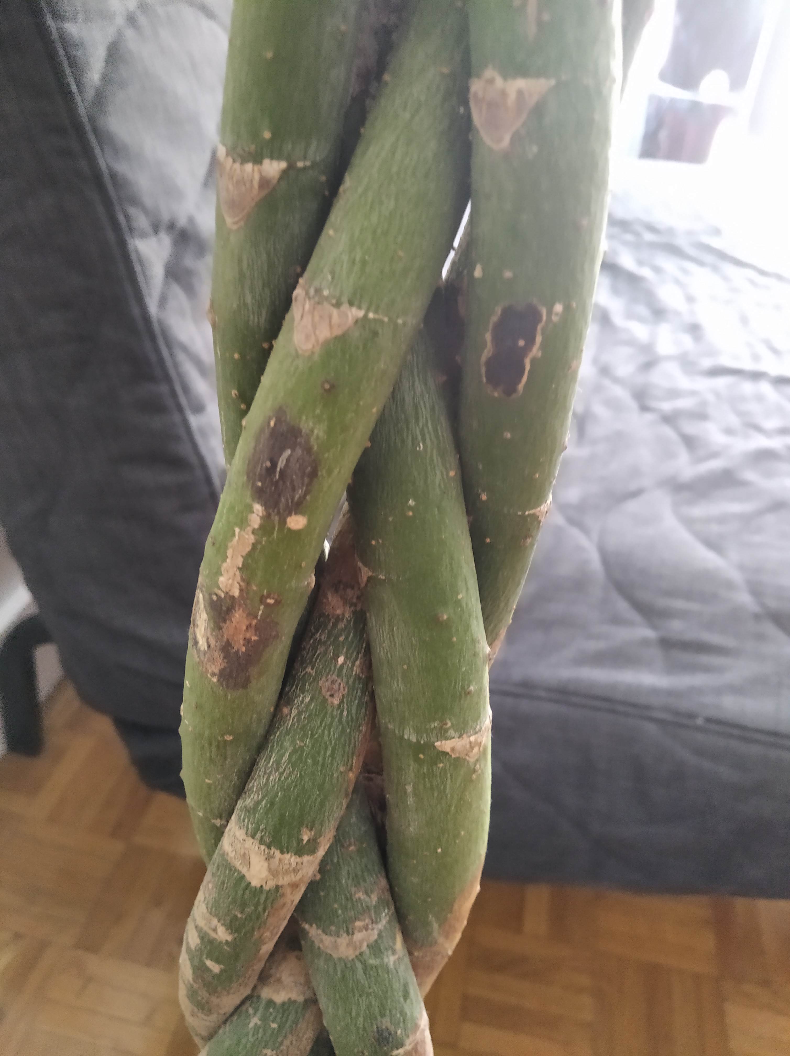 J'ai un pachira exposé plein sud et qui paraît en pleine forme, il fait régulièrement de nouvelles pousses. Il a été rempoté à l'achat il y a un an et je l'arrose une fois par mois (deux fois par mois en juillet/août). Mais depuis quelques semaines des taches noires sont apparues sur le tronc. L'écorce reste dure à ces endroits. Est-ce lié à un parasite, un excès d'arrosage ? Que puis-je faire ?