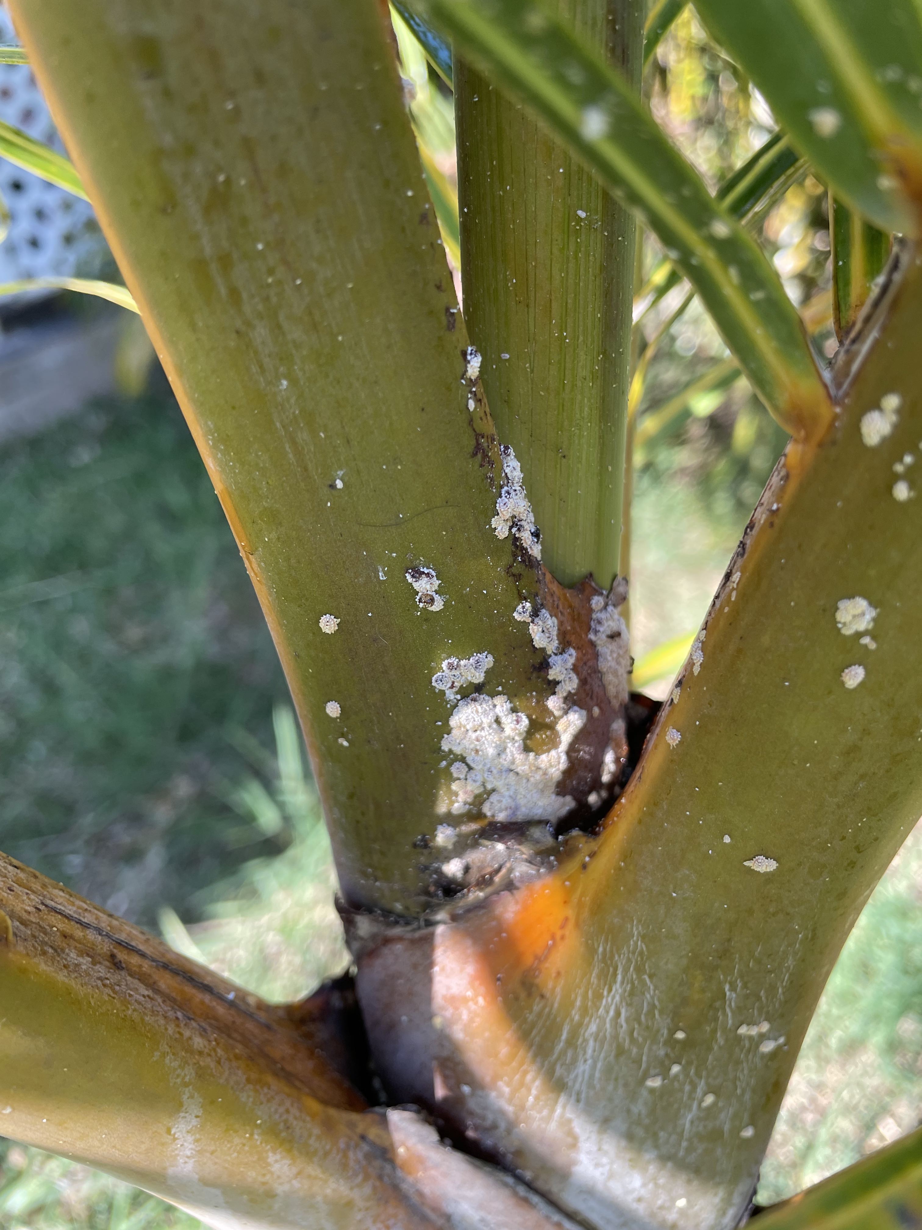 Nous avons la chance d'avoir un petit jardin avec de la verdure mais je m'aperçois que beaucoup d'arbre et de bougainvilliers sont complétement grignotés, les feuilles sèchent et j'ai des sortes de petites bêtes blanches dessus (cf. photos).