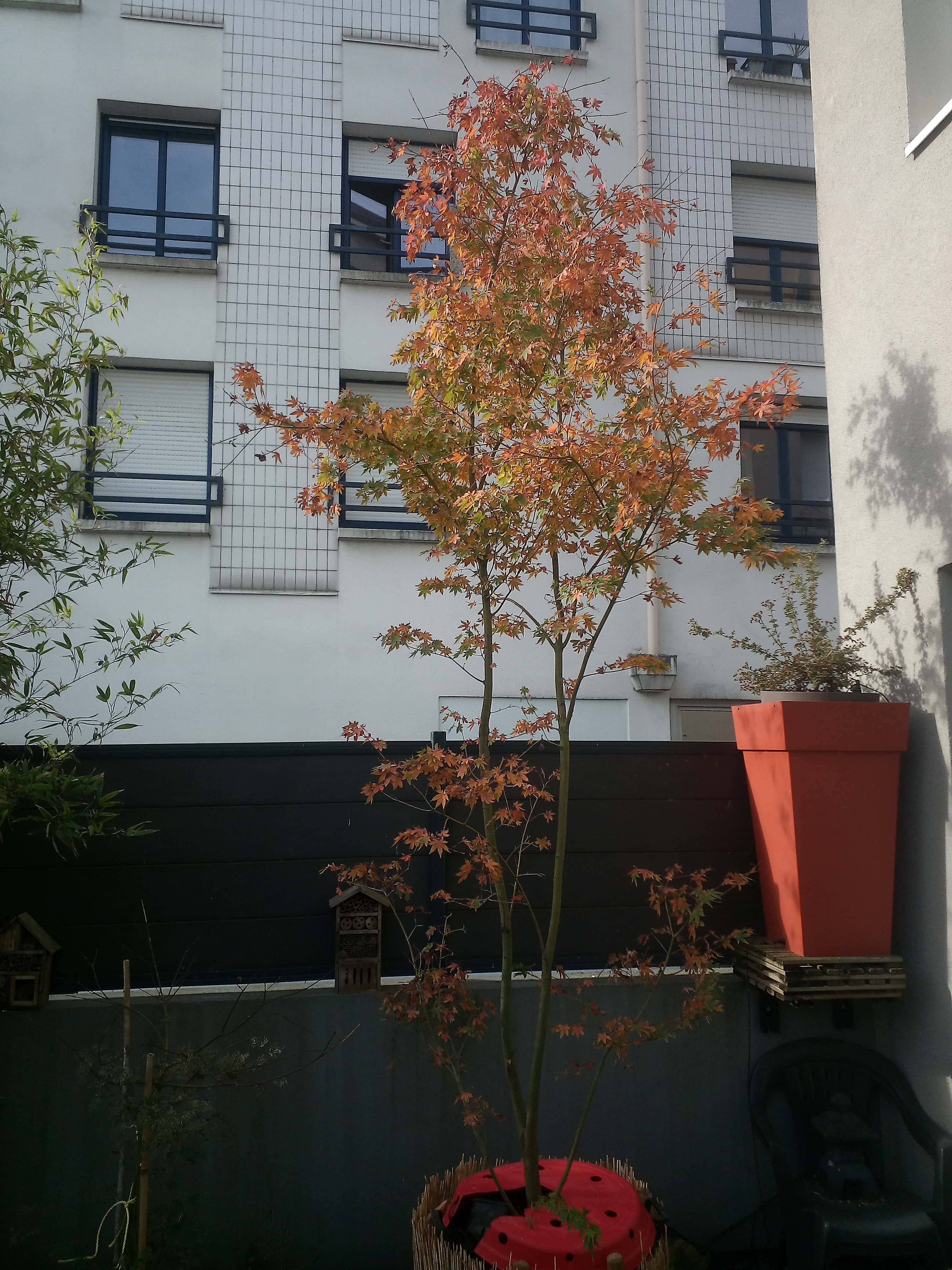 Pour ma par mon palmatum a commencé à pas mal se colorer cette semaine Et je l'ai légèrement palissé, à son achat il était attaché en ligne à un tuteur horzontal à côté d'autres palmatums ce qui ne permettait pas à toutes les branches de se développer normalement Deux petits tuyaux d'irrigation souple de 3mm sur 2 branches et un caillou attaché à une petite branche