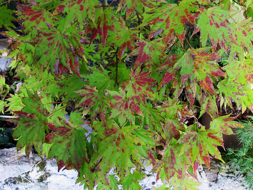 J'ai gardé les 2 miens à l'ombre, sauf le bonsaï qui a été un peu au soleil en début de saison. Mais le pied-mère, dans un pot bleu ciel derrière le premier, est encore bien vert. Les nuances de couleur du petit sont spectaculaires, c'est sans doute ma plus belle photo de cette saison, je trouve :