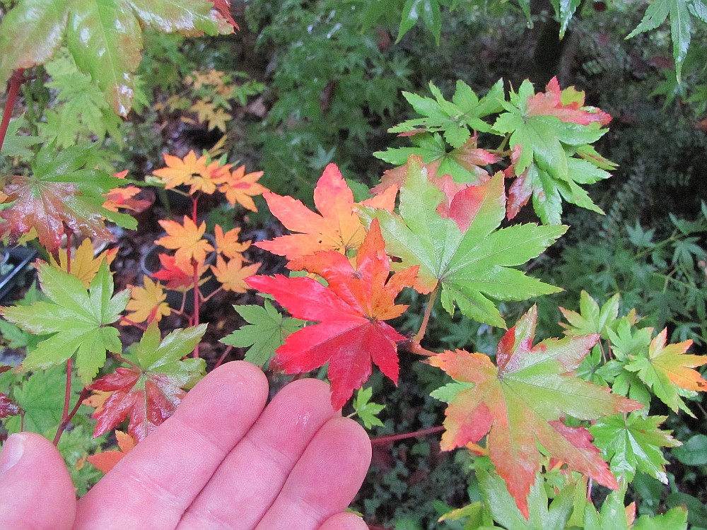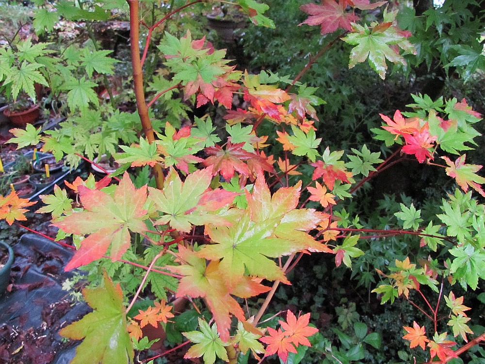 'Osakazuki' commence à avoir quelques feuilles bien rouges mais l'ensemble du feuillage reste encore dans les tons intermédiaires de verts, de jaunes et differents rouges.