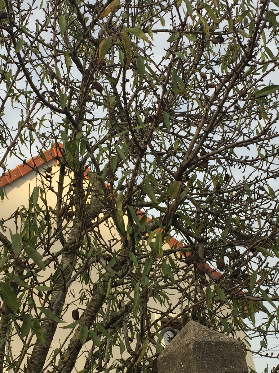 « L’amandier » est exposé au sud avec la maison blanche qui se trouve, elle, au nord. Plus à gauche, donc côté ouest, la topographie de la ville monte et il y a une résidence avec immeubles de 5 étages. Je pense qu’il est bien planté tout comme le grenadier situé devant lui légèrement a gauche. Je vais demander une seconde fois aux ouvriers s’ils acceptent de me donner un échantillon de ces « amandes » visiblement sèches. Ce jardin qui a une histoire me fascine depuis longtemps, une vraie pépite.