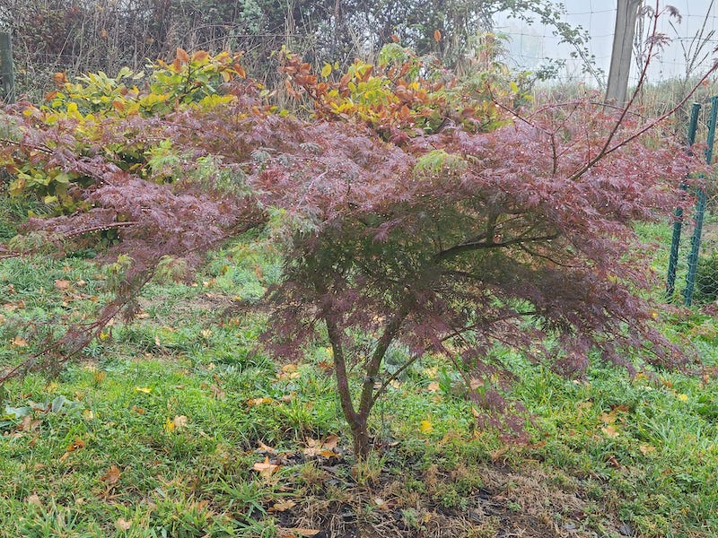 J’ai quelques érables qui ont conservé des feuilles, elles sont en train de se colorer. Ce sont 3 érables de graine non greffés, arakawa (en retard car à l’ombre), kamagata (toujours tardif). Quelques photos bientôt.