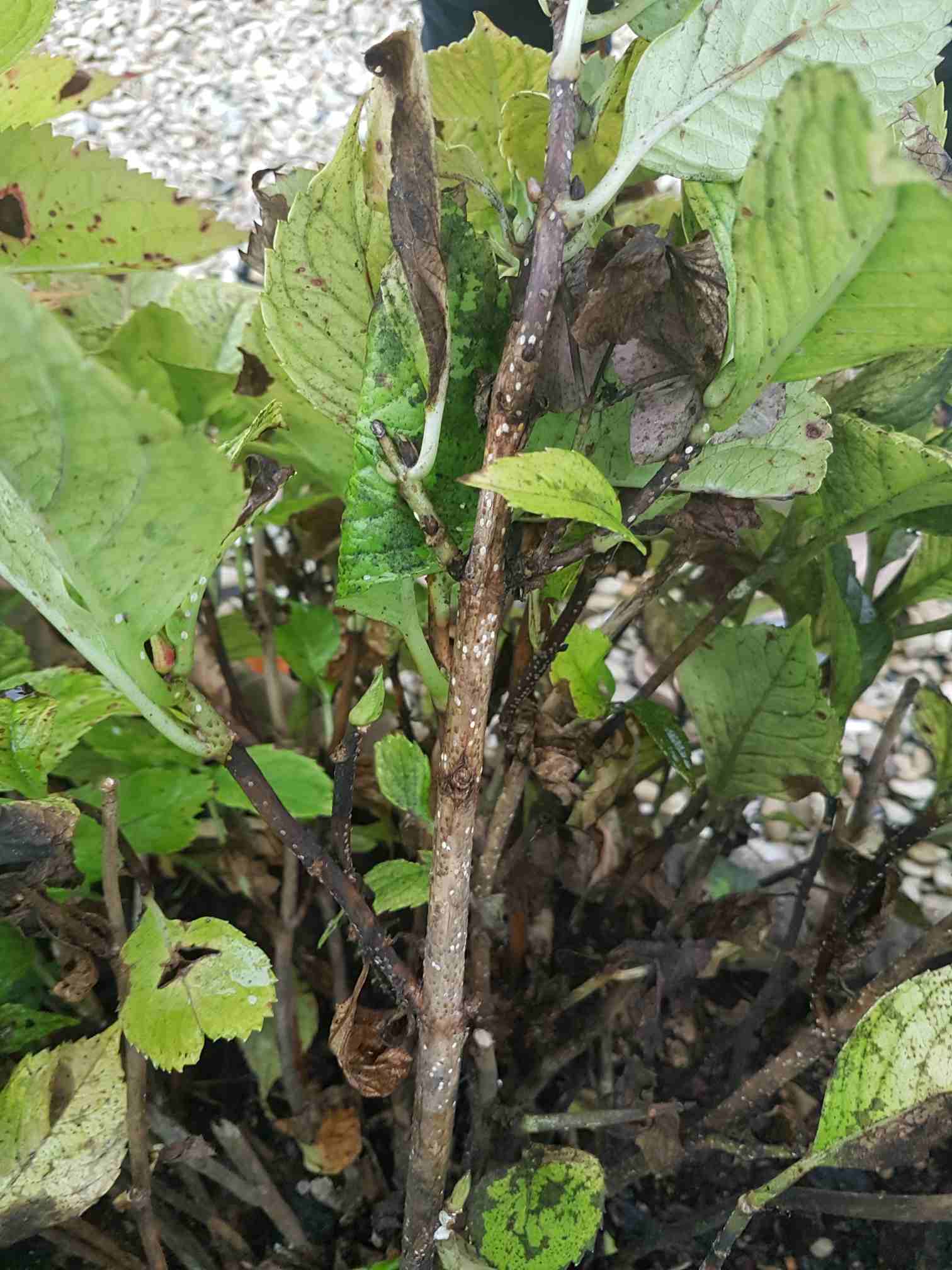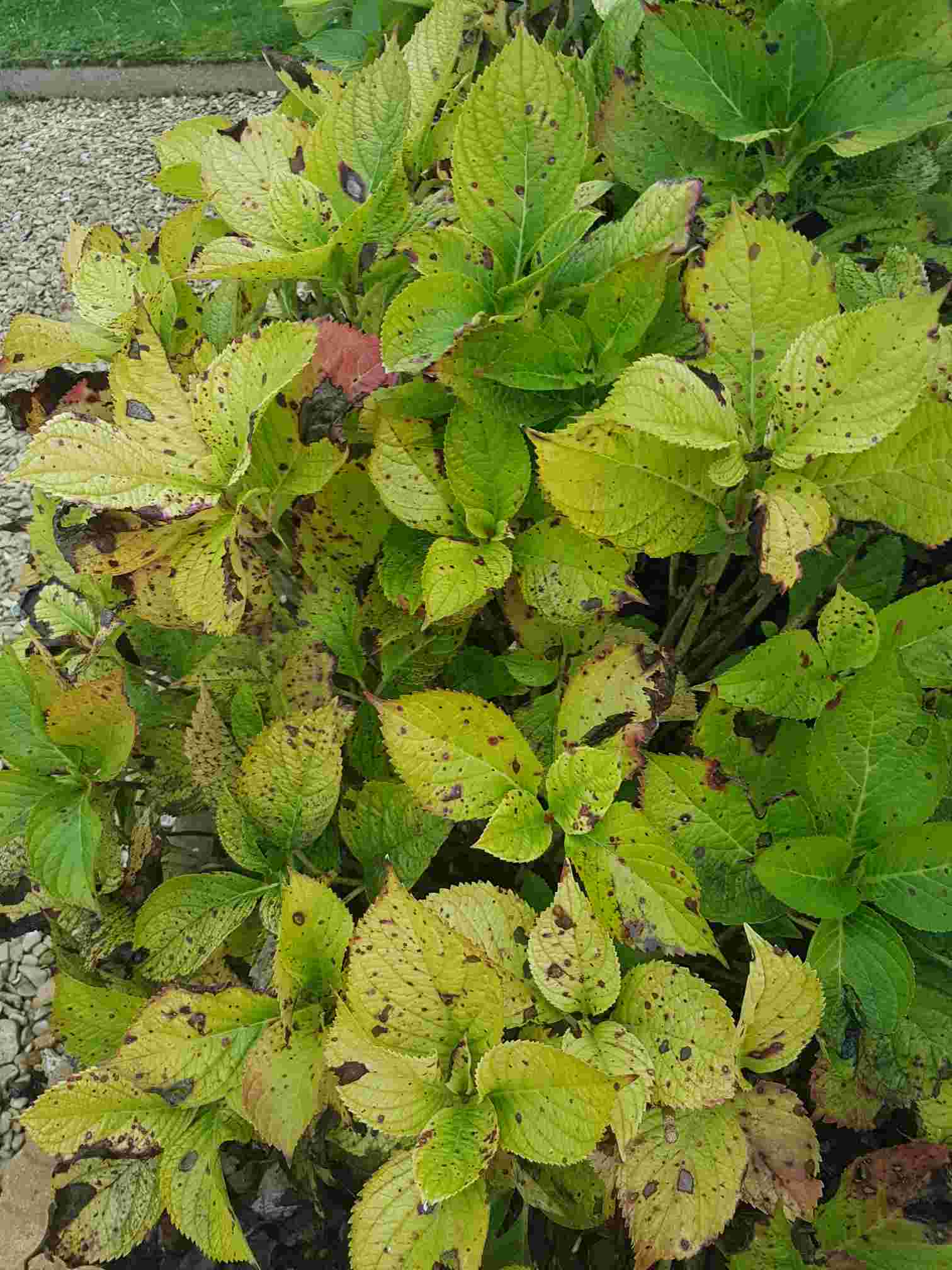 J'aimerais avoir votre avis concernant mes hortensias qui présentent des feuilles tachetées de noir et jaune ainsi que des tiges noircies et avec des dépôts blanchâtres.