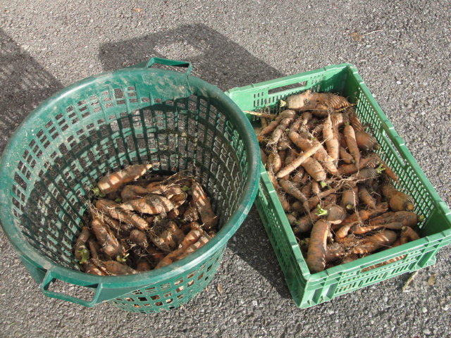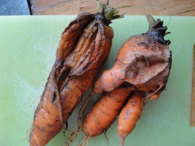 Au début novembre j'ai pu ramasser ces carottes en les triant en deux qualités: 3/4 de vendables et 1/4 de non-vendables (!) à cause de leur aspect.