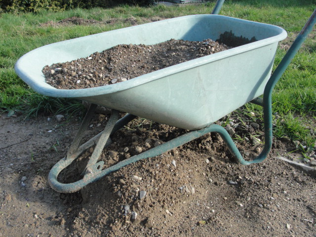 Difficile avec une brouette qui n'a plus de roue depuis l'arrêt de la construction du nouvel étang.