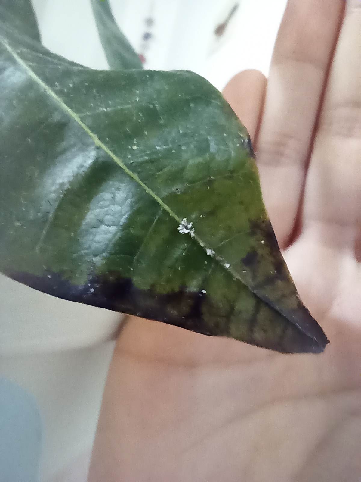 j'ai fais germé un manguier il y a 1 an, voici 3 semaines que des taches brunes sont apparus (voir photos si joint), et aujourd'hui j'ai remarqué sous les feuilles des sortent d'œufs ou bestioles blanches (si joint). une bestiole marron a été trouvé également (1 unique individu) est-ce ses œufs ? quelqu'un sait ce que c'est et comment je peux soigné mon manguier ?
