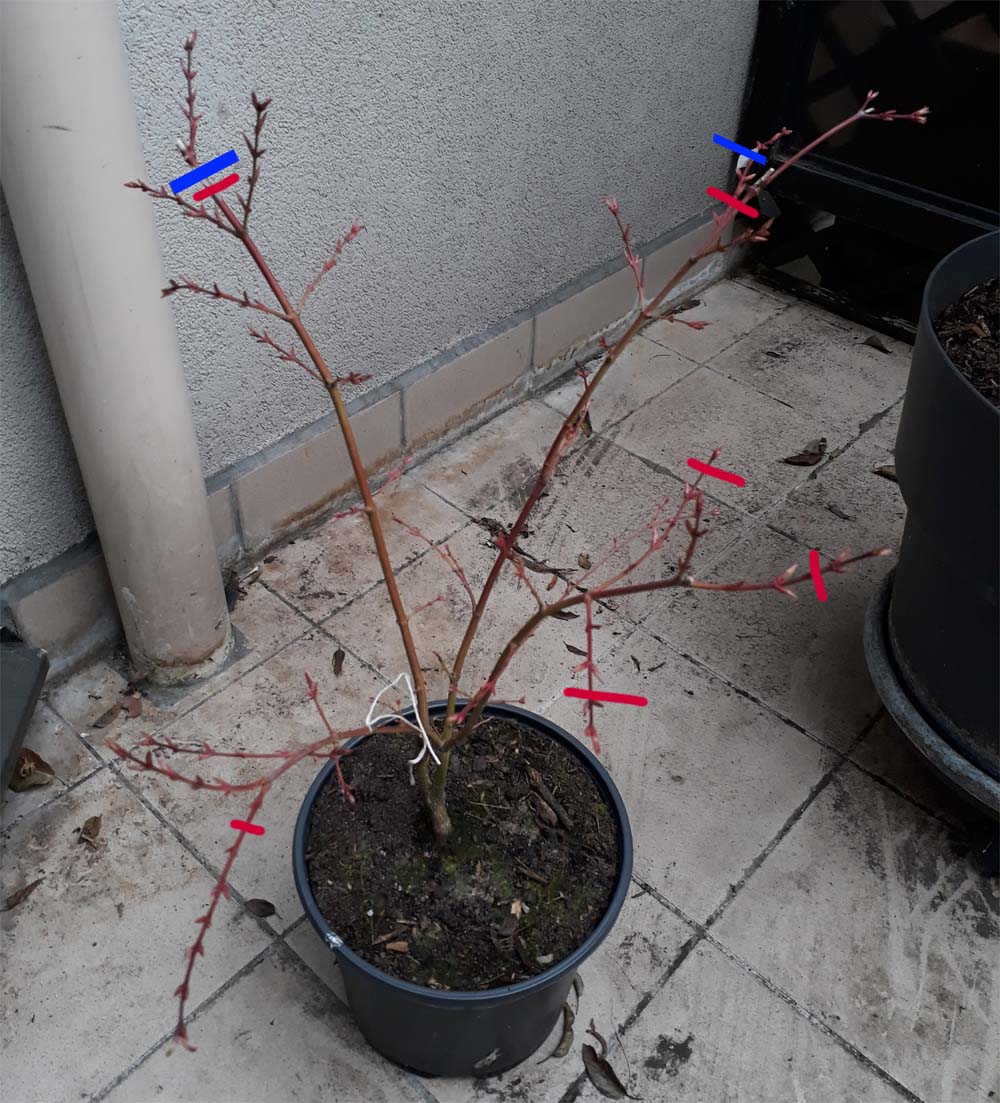 Ce que je cherche à produire en taillant en haut à droite, c’est de retirer les bourgeons qui se trouvent sur des bois faibles pour privilégier 1 ou 2 bourgeons capables de se développer mieux. Mais c’est le changement de substrat qui est prioritaire pour le futur de ton érable.