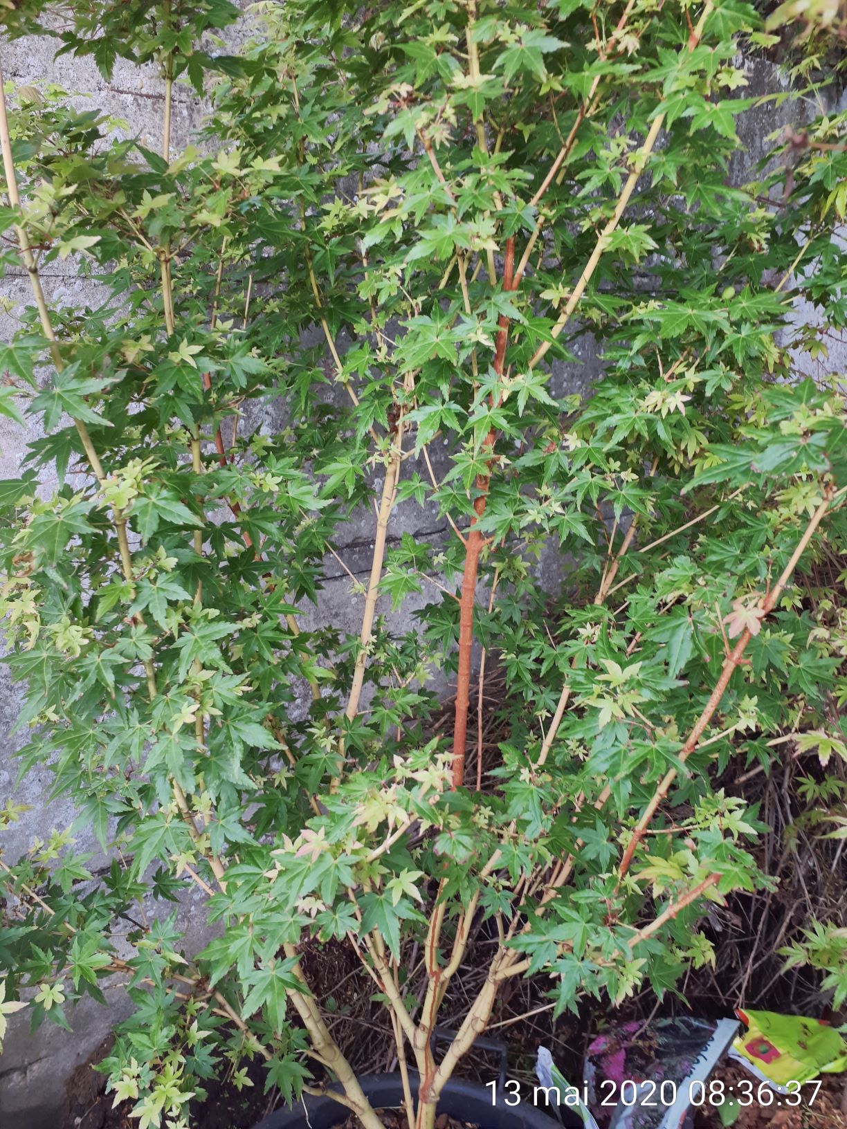 Voici le mien cette annĂ©e, rien Ă signaler sinon qu'il me fait de nouvelles pousses un peu partout. Le voici dans son pot, dans un coin protĂ©gĂ© au fond du jardin, entourĂ© d'une mini forĂȘt d'Ă©rables... Photo mĂ©diocre prise avec le tĂ©lĂ©phone.