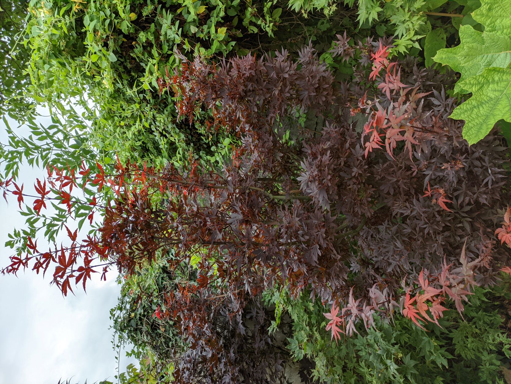 C'est un très beau spécimen Christelle ! Au printemps prochain, il serait peut-être temps d'élaguer le bas, pour qu'il s'étoffe davantage en haut. Si tu le mets en terre, tu y gagnera esthétiquement en faisant apparaître le tronc et les charpentières et sur le plan pratique tu pourras placer d'autres plantes plus basses autour de lui. Installe le dans un massif en l'associant à un érable vert clair et un autre jaune. C'est un semi-nain au port droit : place en arrière plan un grand sujet en parapluie qui devient jaune l'hiver, et à ses pieds un dissectum greffé bas qui se colore en orange... 'Skeeter's Broom' ne craint pas le soleil, le mien l'endure presque toute la journée, et il ne verdit pas, il reste d'un très joli rouge cerise (à peine moins vif qu'à le fin du printemps).