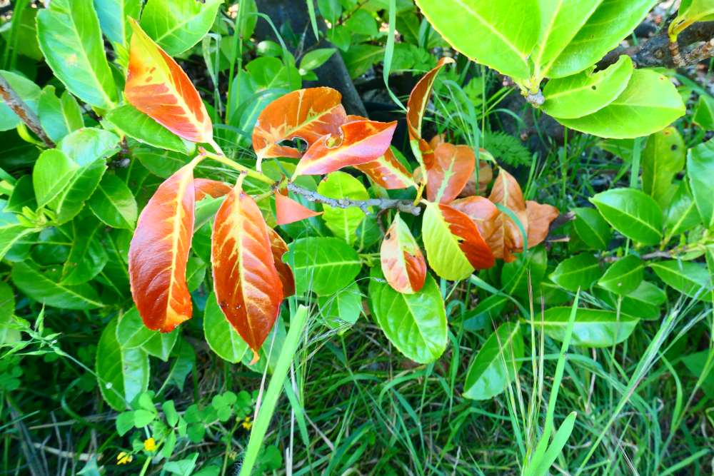 vieillissement et renouvellement naturel de feuilles d'un arbustes persistant.