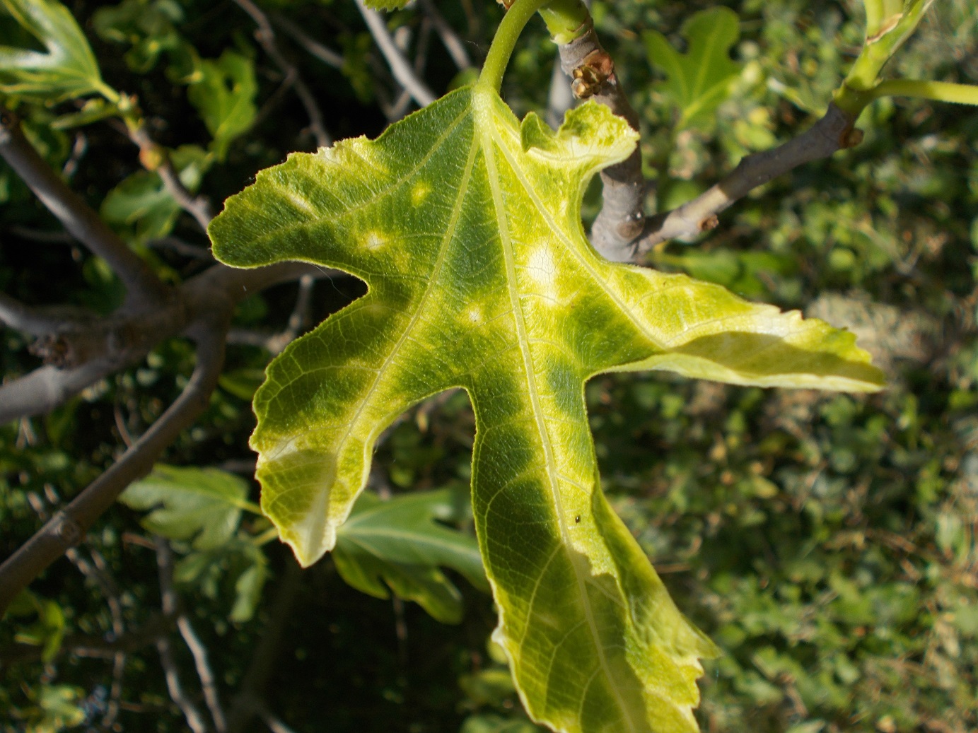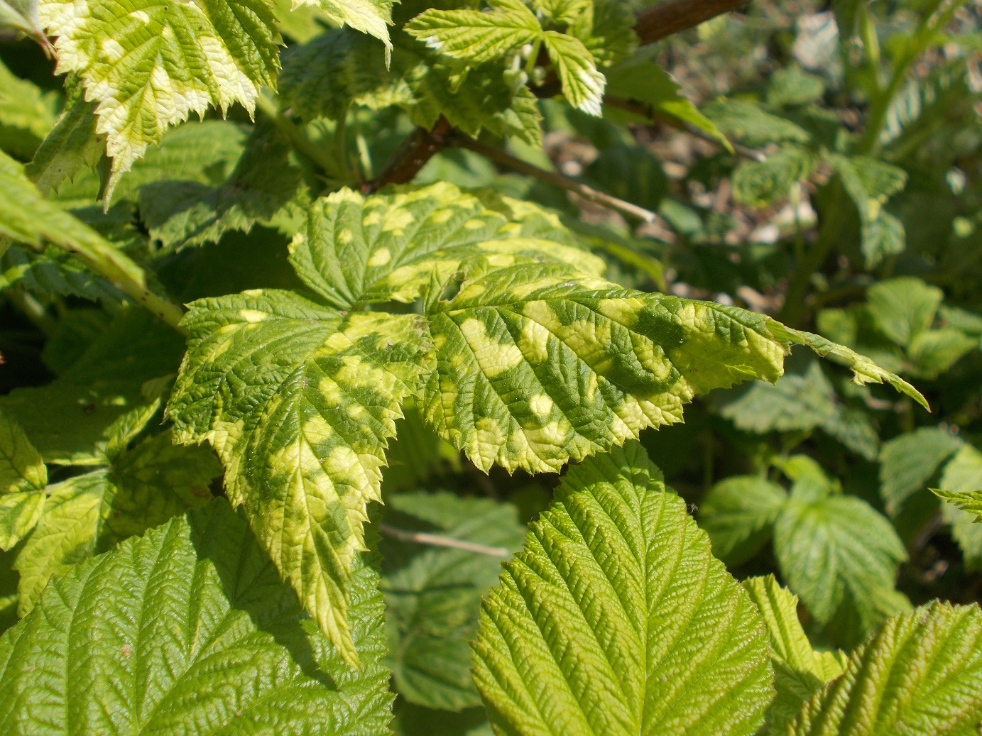 Depuis quelque temps, j'ai des tâches jaunes qui apparaissent sur les feuilles de mes framboisiers et cassis, et aussi sur les feuilles d'un vieux figuier qui est planté à côté.