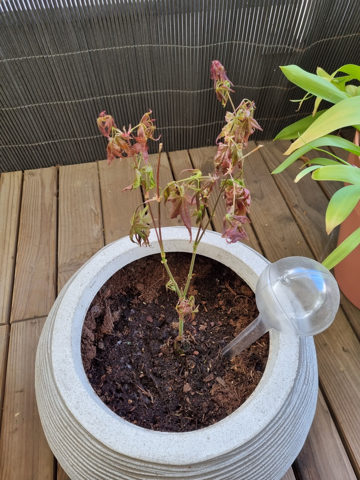 J'ai planté un érable du Japon en pot sur mon balcon l'automne dernier. Il a commencé à bien pousser début Avril, mais depuis une bonne semaine, ses feuilles sont molles ... . Elles ne tombent pas, mais plus rien ne se passe. Pourtant je l'arrose une fois par semaine, avec de l'eau de pluie, des que la terre est sèche (sans être trop sèche).