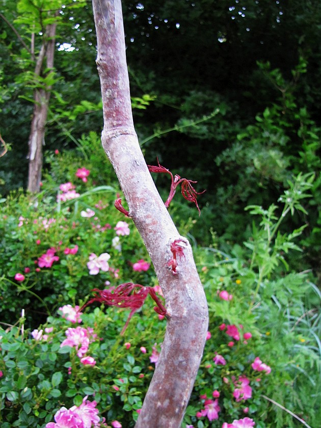 Mais l''Atropurpureum dissectum' que j'ai cru mort explose. Je me demande où partiront les branches : à chaque coupe partent plusieurs branches, très droites pour l'instant; et les feuilles sont très grandes. J'(attends la sélection naturelle après l'été, puis l'automne, l'hiver, et le printemps prochain :