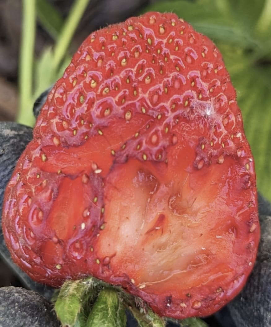 Ce genre de dégât correspond bien à celui d'une petite limace noire. J'en trouve souvent prises en flagrant délit et qui sont restées dans la fraise ainsi grignotée.