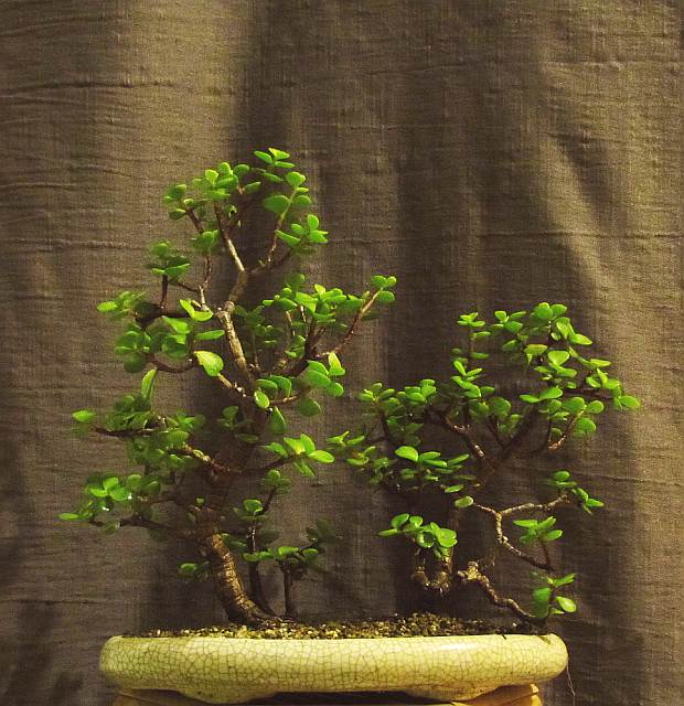 Mais on peut tout à fait cultiver des plantes qu'on rentre à l'intérieur l'hiver et auxquelles on donne "un air de bonsaï". Par exemple, il est facile de s'amuser avec des crassulacées par exemple, que l'on rentre l'hiver et qu'on sort l'été, comme ces amusements (la Portulacaria n'a pas survécue, intérieur trop sec et pas assez de lumière, mais les Crassula sont increvables) :