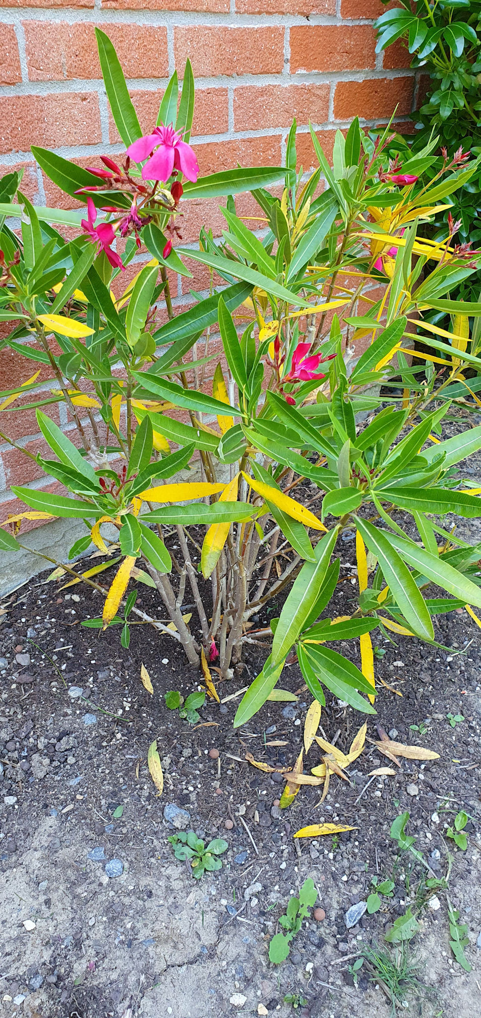 Un des lauriers roses (quelques années d'existence) perd ses feuilles qui jaunissent (les autres sont ok).