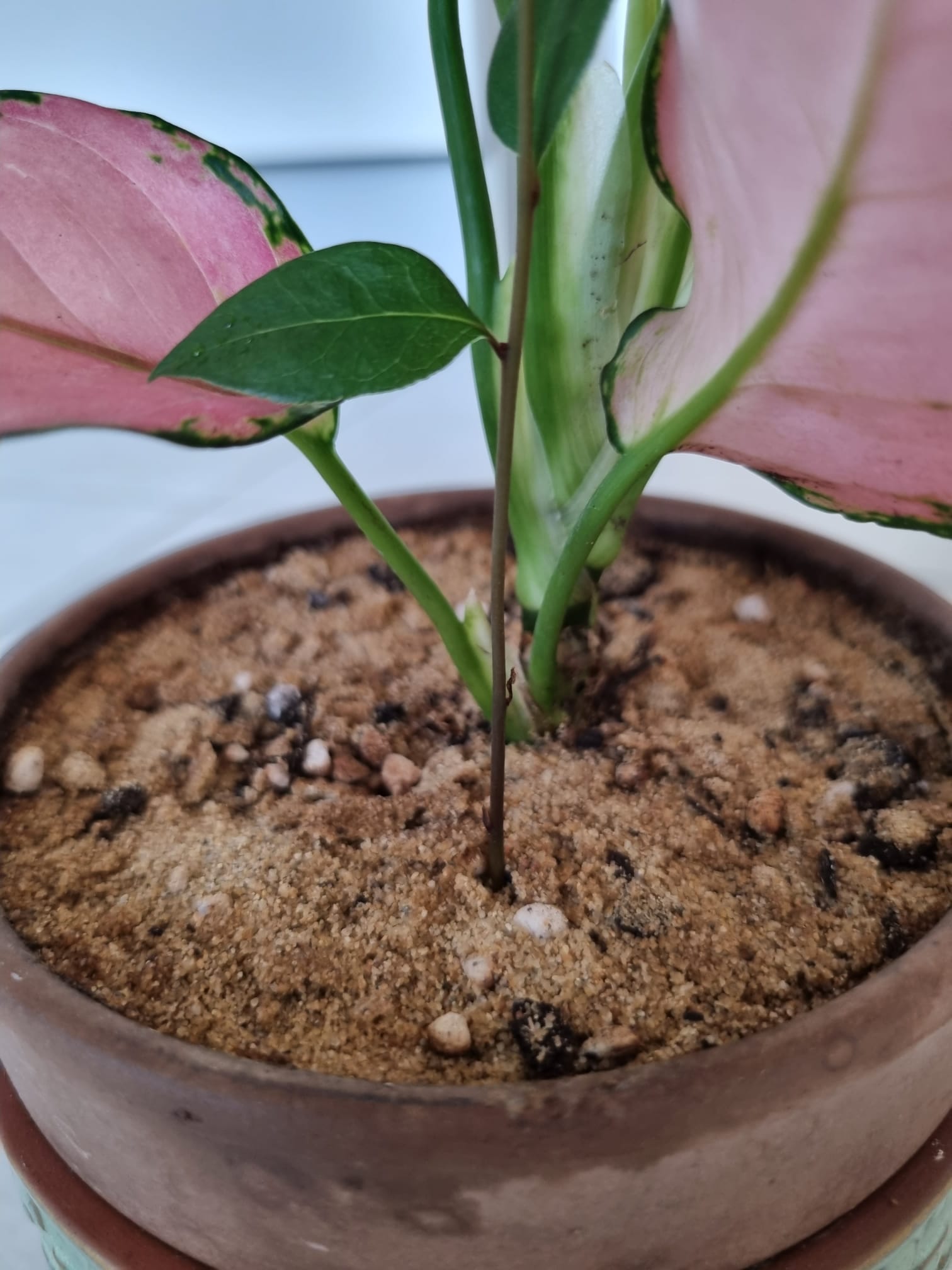 Je me suis d'abord dit que c'était un bébé Aglaonema, mais elle continue de pousser, et sa forme et sa couleur ne ressemblent pas à celles de la supposée plante mère !